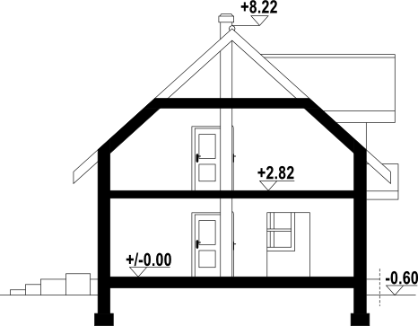 Wysokość ścianki kolankowej: 1.18 m. Strop: płyta żelbetowa. Pokrycie dachu: dachówka ceramiczna. Ściany zewnętrzne: pustaki ceramiczne + styropian. Ściany wewnętrzne: pustaki ceramiczne. Typ ogrzewania: kocioł gazowy.