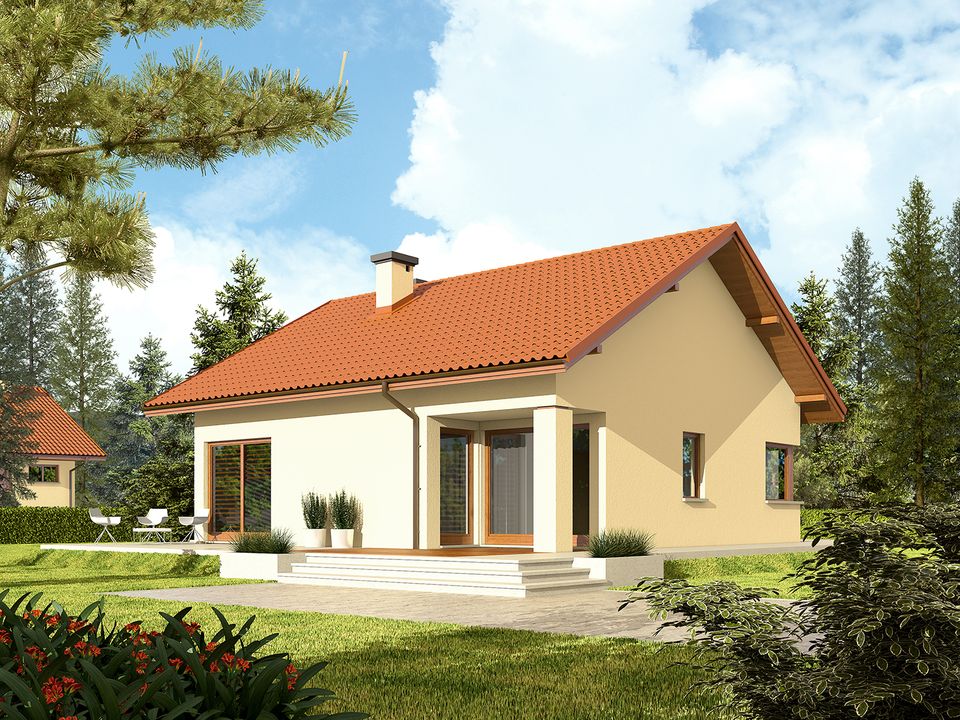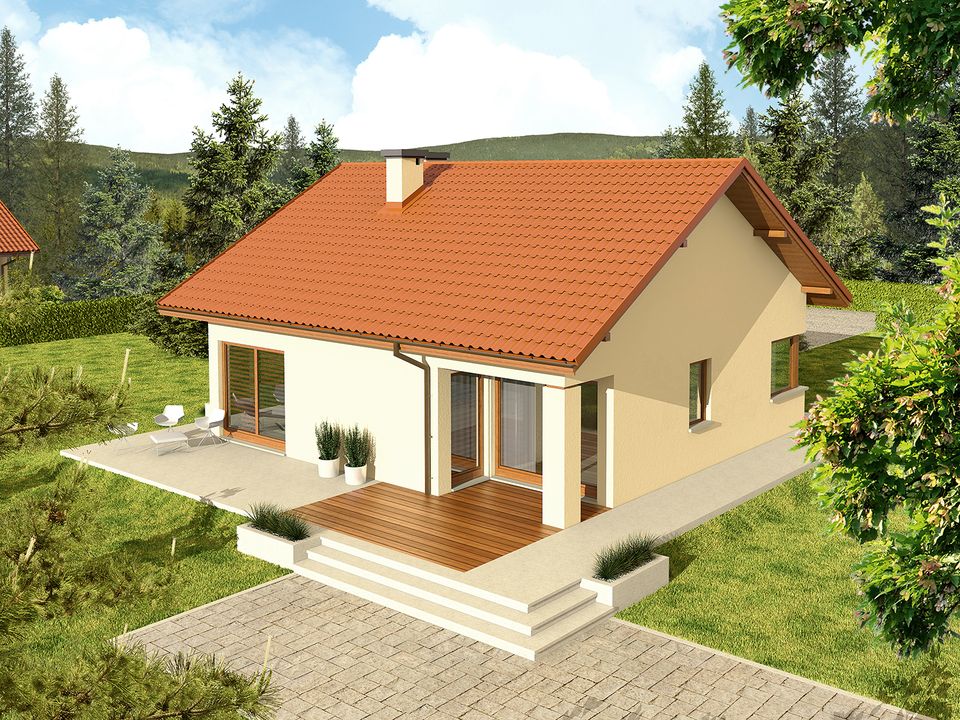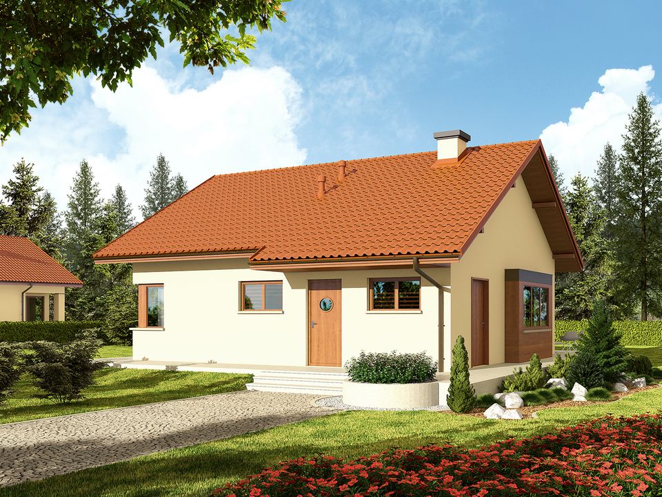 Graficzne opracowanie rzutów poglądowych widocznych na karcie projektu zostało wykonane przez Extradom.pl. Prezentowane przez Extradom.pl wizualizacje wykonane zostały przez autora projektu i należy poczytywać je jedynie za przykład i propozycję wykończenia, wizję architektoniczną autora projektu. Ostateczne wykończenie budynku może nastąpić na wiele sposobów. Szczegółowe rozwiązania zastosowane w oferowanej dokumentacji - w tym również ilość, lokalizacje i wygląd okien, drzwi, kominów - mogą w niewielkim stopniu różnić się od prezentowanej wizualizacji budynku.