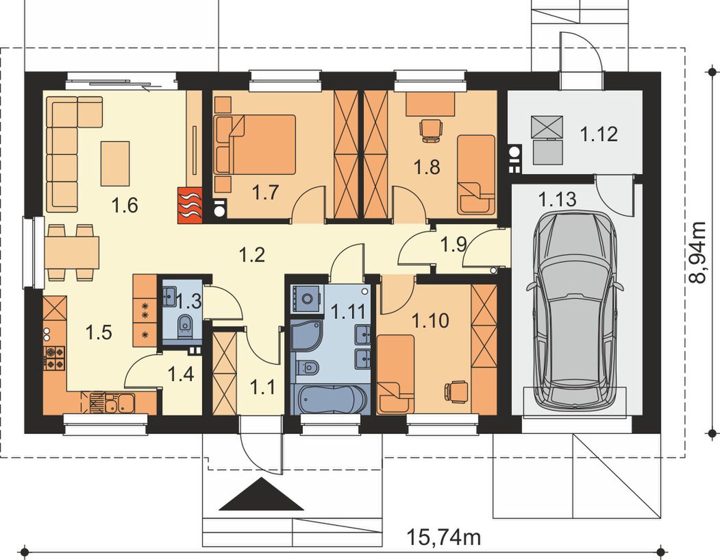 Graficzne opracowanie rzutów poglądowych widocznych na karcie projektu zostało wykonane przez Extradom.pl. Prezentowane przez Extradom.pl wizualizacje wykonane zostały przez autora projektu i należy poczytywać je jedynie za przykład i propozycję wykończenia, wizję architektoniczną autora projektu. Ostateczne wykończenie budynku może nastąpić na wiele sposobów. Szczegółowe rozwiązania zastosowane w oferowanej dokumentacji - w tym również ilość, lokalizacje i wygląd okien, drzwi, kominów - mogą w niewielkim stopniu różnić się od prezentowanej wizualizacji budynku.