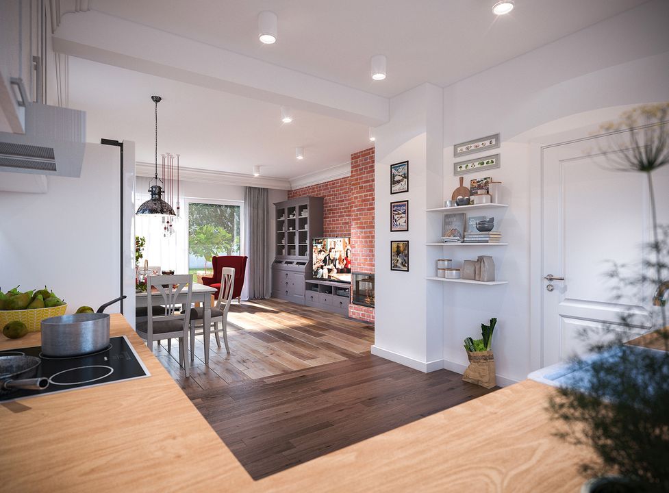 Centrum życia rodzinnego stanowi przestronna, otwarta strefa dzienna, łącząca salon, jadalnię i kuchnię. To idealne miejsce do wspólnego spędzania czasu, a kominek dodaje wnętrzu przytulności. Z salonu prowadzi bezpośrednie wyjście na taras, który w naturalny sposób powiększa przestrzeň wypoczynkową w cieplejsze dni. Funkcjonalność kuchni podnosi umieszczona tuż obok spiżarnia. W drugiej, bardziej prywatnej części domu, zaprojektowano dwie komfortowe sypialnie, w tym jedną z wydzieloną garderobą, oraz ogólnodostępną łazienkę. Układ uzupełnia toaleta dla gości zlokalizowana blisko wejścia, a także praktyczne zaplecze z kotłownią i pomieszczeniem gospodarczym, połączone z garażem.