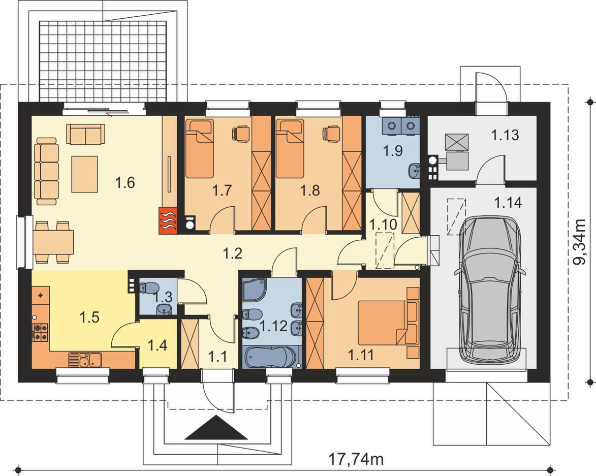 Graficzne opracowanie rzutów poglądowych widocznych na karcie projektu zostało wykonane przez Extradom.pl. Prezentowane przez Extradom.pl wizualizacje wykonane zostały przez autora projektu i należy poczytywać je jedynie za przykład i propozycję wykończenia, wizję architektoniczną autora projektu. Ostateczne wykończenie budynku może nastąpić na wiele sposobów. Szczegółowe rozwiązania zastosowane w oferowanej dokumentacji - w tym również ilość, lokalizacje i wygląd okien, drzwi, kominów - mogą w niewielkim stopniu różnić się od prezentowanej wizualizacji budynku.