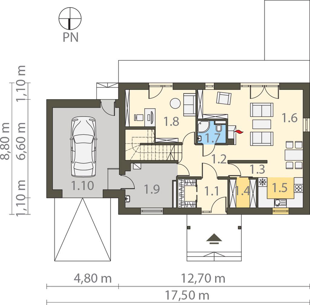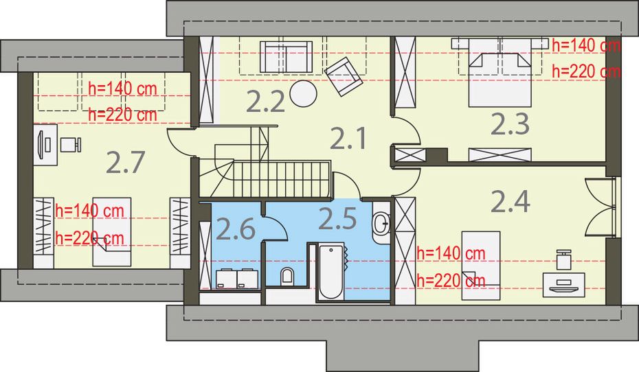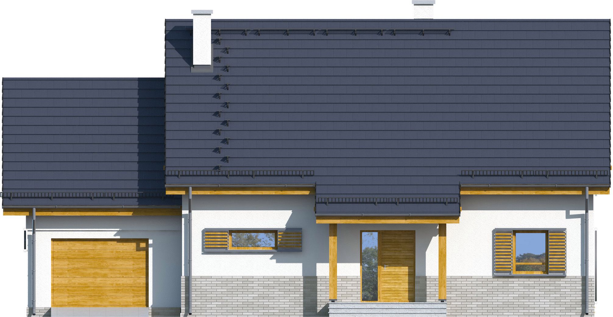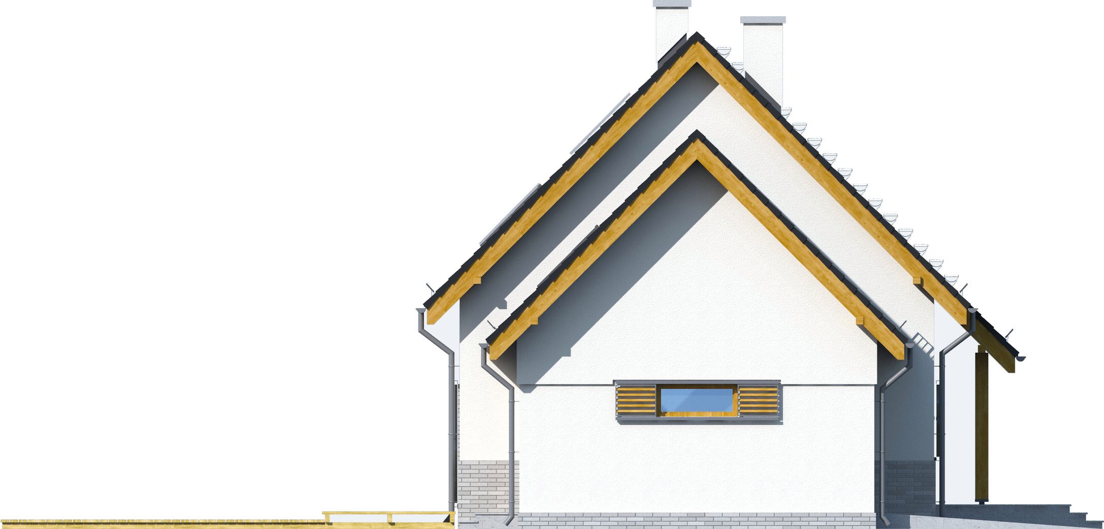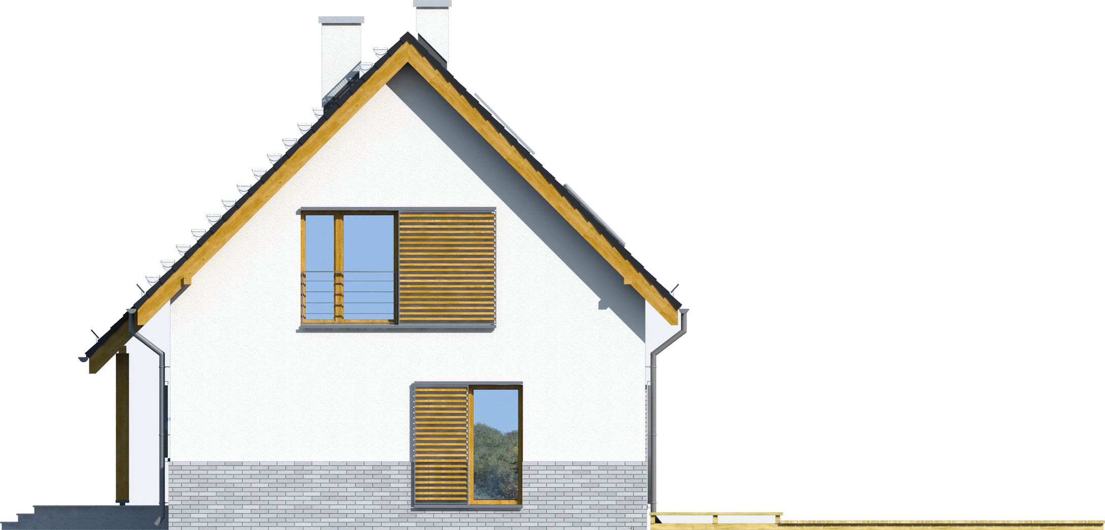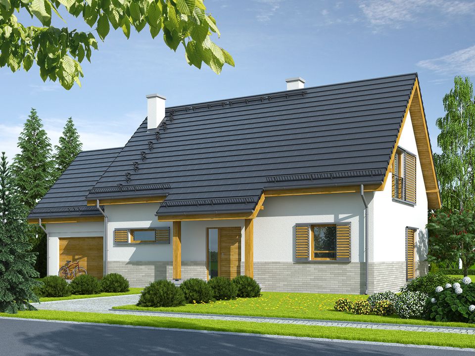 Graficzne opracowanie rzutów poglądowych widocznych na karcie projektu zostało wykonane przez Extradom.pl. Prezentowane przez Extradom.pl wizualizacje wykonane zostały przez autora projektu i należy poczytywać je jedynie za przykład i propozycję wykończenia, wizję architektoniczną autora projektu. Ostateczne wykończenie budynku może nastąpić na wiele sposobów. Szczegółowe rozwiązania zastosowane w oferowanej dokumentacji - w tym również ilość, lokalizacje i wygląd okien, drzwi, kominów - mogą w niewielkim stopniu różnić się od prezentowanej wizualizacji budynku.