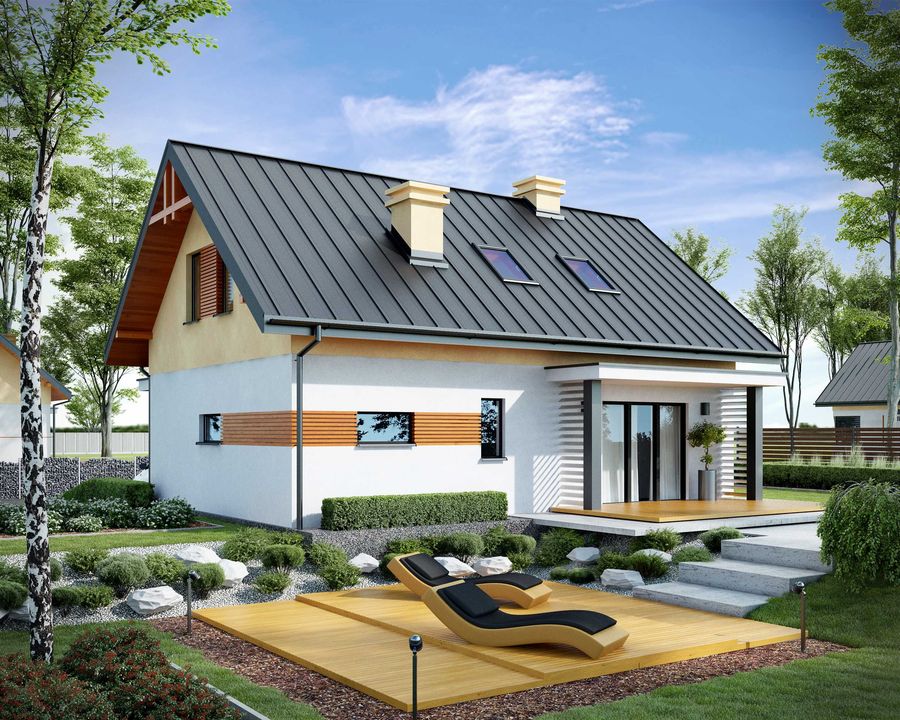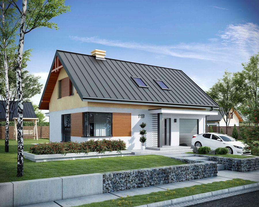 Graficzne opracowanie rzutów poglądowych widocznych na karcie projektu zostało wykonane przez Extradom.pl. Prezentowane przez Extradom.pl wizualizacje wykonane zostały przez autora projektu i należy poczytywać je jedynie za przykład i propozycję wykończenia, wizję architektoniczną autora projektu. Ostateczne wykończenie budynku może nastąpić na wiele sposobów. Szczegółowe rozwiązania zastosowane w oferowanej dokumentacji - w tym również ilość, lokalizacje i wygląd okien, drzwi, kominów - mogą w niewielkim stopniu różnić się od prezentowanej wizualizacji budynku.