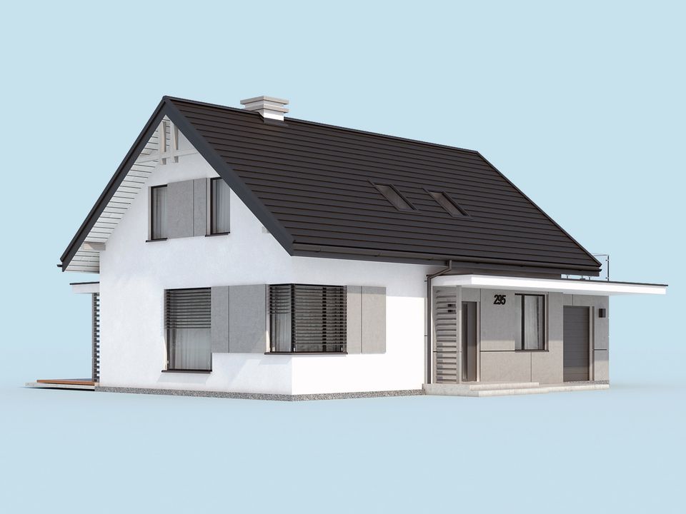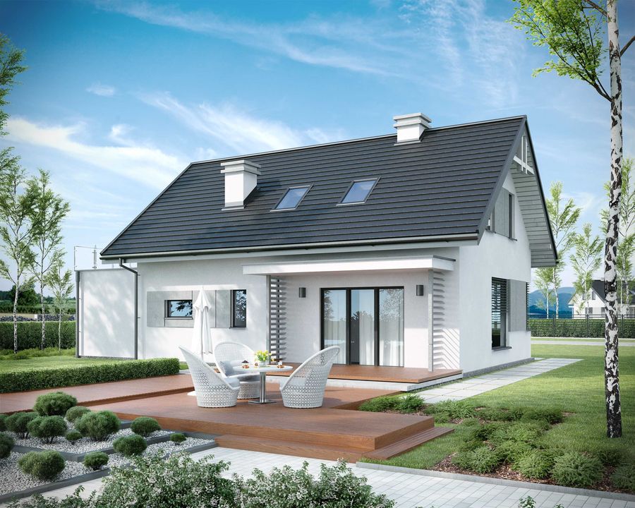 Graficzne opracowanie rzutów poglądowych widocznych na karcie projektu zostało wykonane przez Extradom.pl. Prezentowane przez Extradom.pl wizualizacje wykonane zostały przez autora projektu i należy poczytywać je jedynie za przykład i propozycję wykończenia, wizję architektoniczną autora projektu. Ostateczne wykończenie budynku może nastąpić na wiele sposobów. Szczegółowe rozwiązania zastosowane w oferowanej dokumentacji - w tym również ilość, lokalizacje i wygląd okien, drzwi, kominów - mogą w niewielkim stopniu różnić się od prezentowanej wizualizacji budynku.