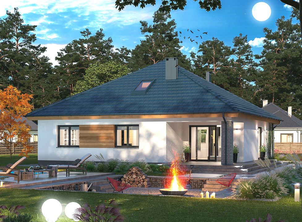 Projekt Tryton 3 B charakteryzuje się zwartą, parterową bryłą przykrytą eleganckim dachem namiotowym. Klasyczny okap dachowy podkreśla tradycyjny styl budynku, chroniąc jednocześnie ściany przed opadami. Prosta forma architektoniczna nie tylko nadaje domowi ponadczasowy wygląd, ale również przekłada się na oszczędność i efektywność podczas budowy. Duże przeszklenia, w tym wyjście na taras, doskonale doświetlają wnętrze i harmonijnie łączą dom z otaczającym go ogrodem.