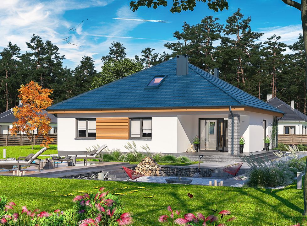 To idealna propozycja dla 3-4 osobowej rodziny, która poszukuje komfortowego i funkcjonalnego domu parterowego w tradycyjnym stylu. Rozłożysta bryła przykryta charakterystycznym dachem namiotowym kryje przemyślane wnętrze z wyraźnym podziałem na strefy, zapewniając wygodę na co dzień.