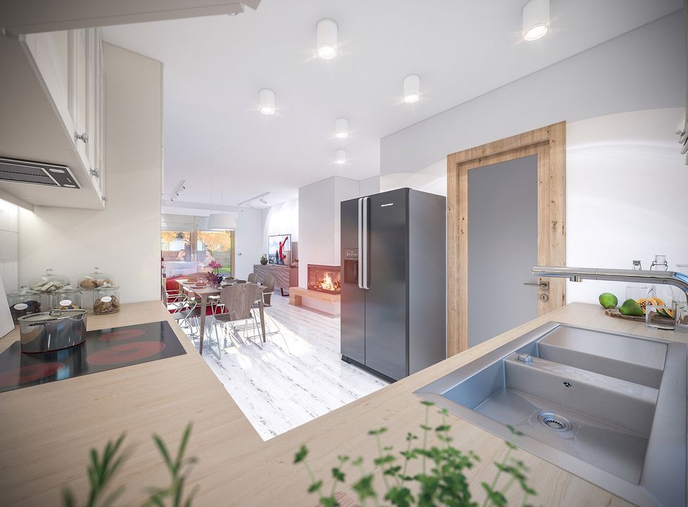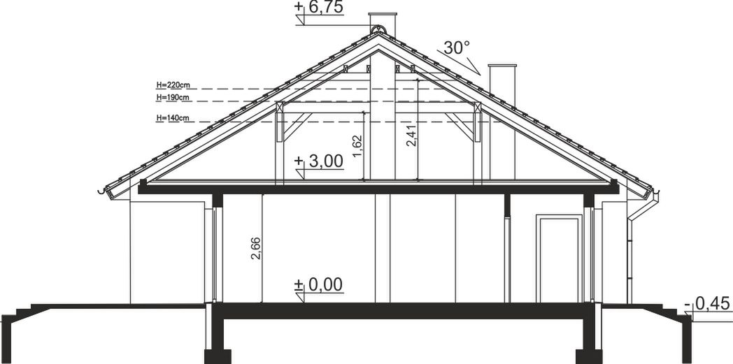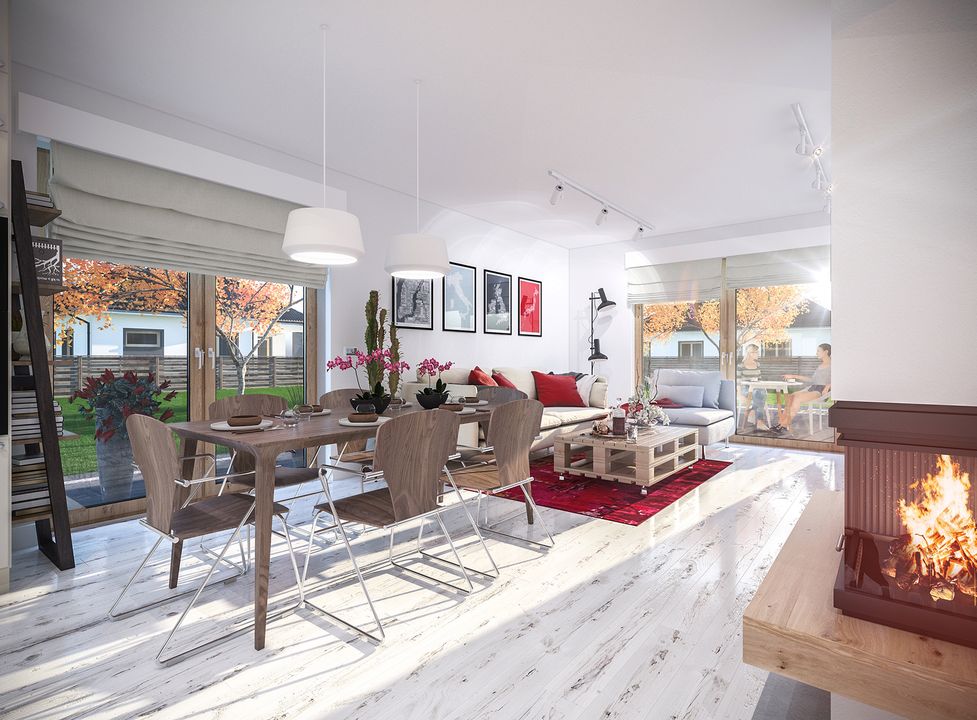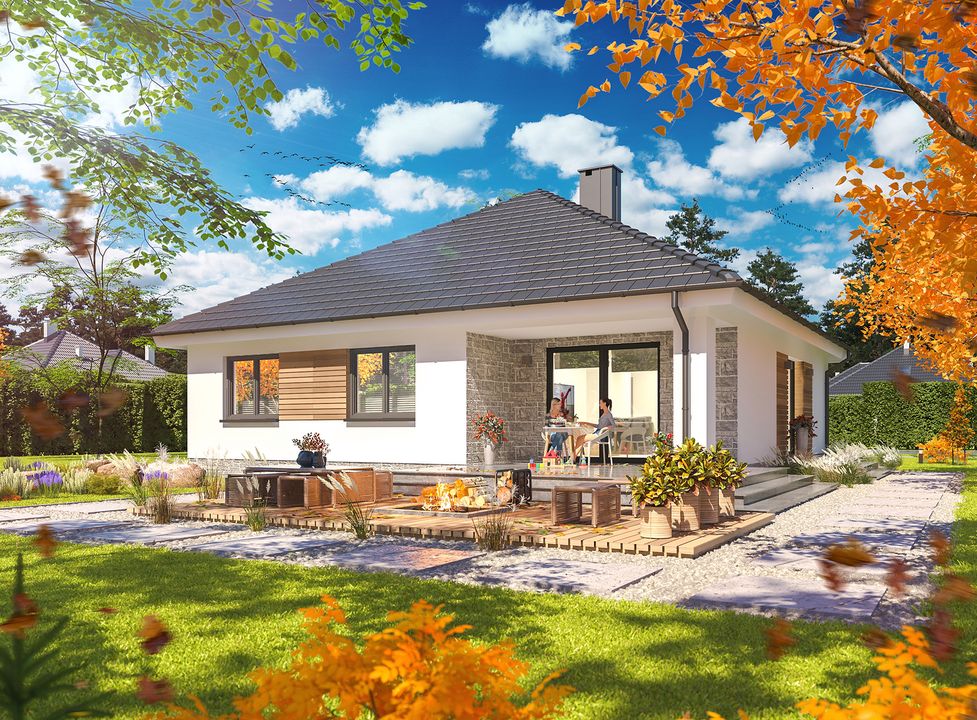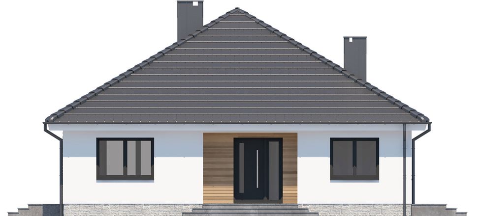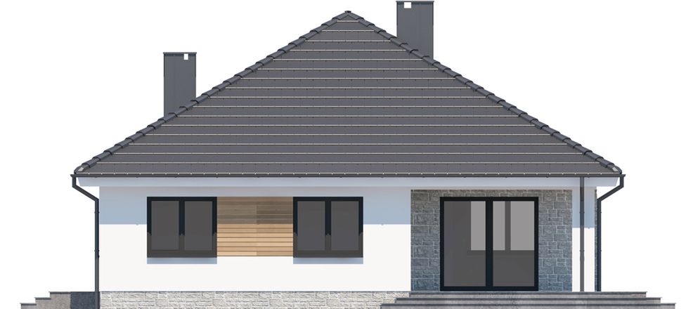 Graficzne opracowanie rzutów poglądowych widocznych na karcie projektu zostało wykonane przez Extradom.pl. Prezentowane przez Extradom.pl wizualizacje wykonane zostały przez autora projektu i należy poczytywać je jedynie za przykład i propozycję wykończenia, wizję architektoniczną autora projektu. Ostateczne wykończenie budynku może nastąpić na wiele sposobów. Szczegółowe rozwiązania zastosowane w oferowanej dokumentacji - w tym również ilość, lokalizacje i wygląd okien, drzwi, kominów - mogą w niewielkim stopniu różnić się od prezentowanej wizualizacji budynku.