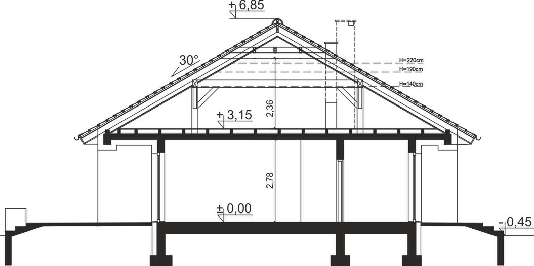 Budynek posadowiony został na fundamentach betonowych. Ściany zewnętrzne dwuwarstwowe z betonu komórkowego 24cm + 20cm styropianu. Ściany wewnętrzne z betonu komórkowego jak i z płyty gipsowo-kartonowej [na ruszcie]. Strop żelbetowy-wylewany. Więźba dachowa drewniana. Pokrycie dachu - dachówka ceramiczna lub cementowa. Wentylacja grawitacyjna + wentylacja mechaniczna z rekuperacją (do wyboru na etapie adaptacji). Ogrzewanie paliwo stałe - biomasa + gaz (do wyboru na etapie adaptacji projektu).