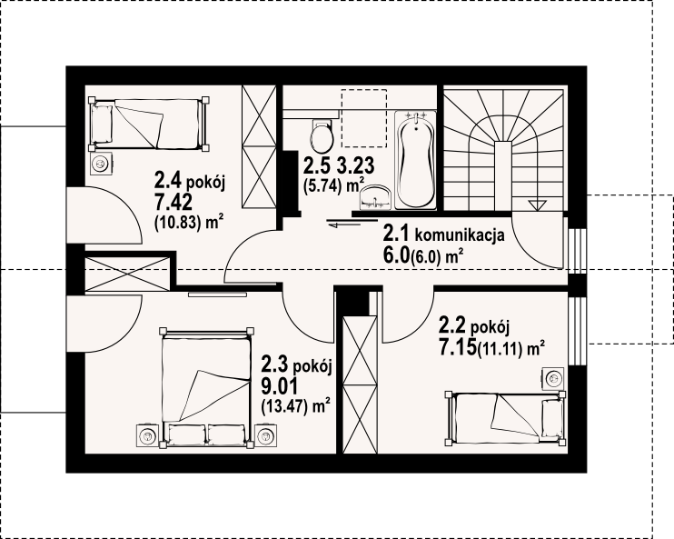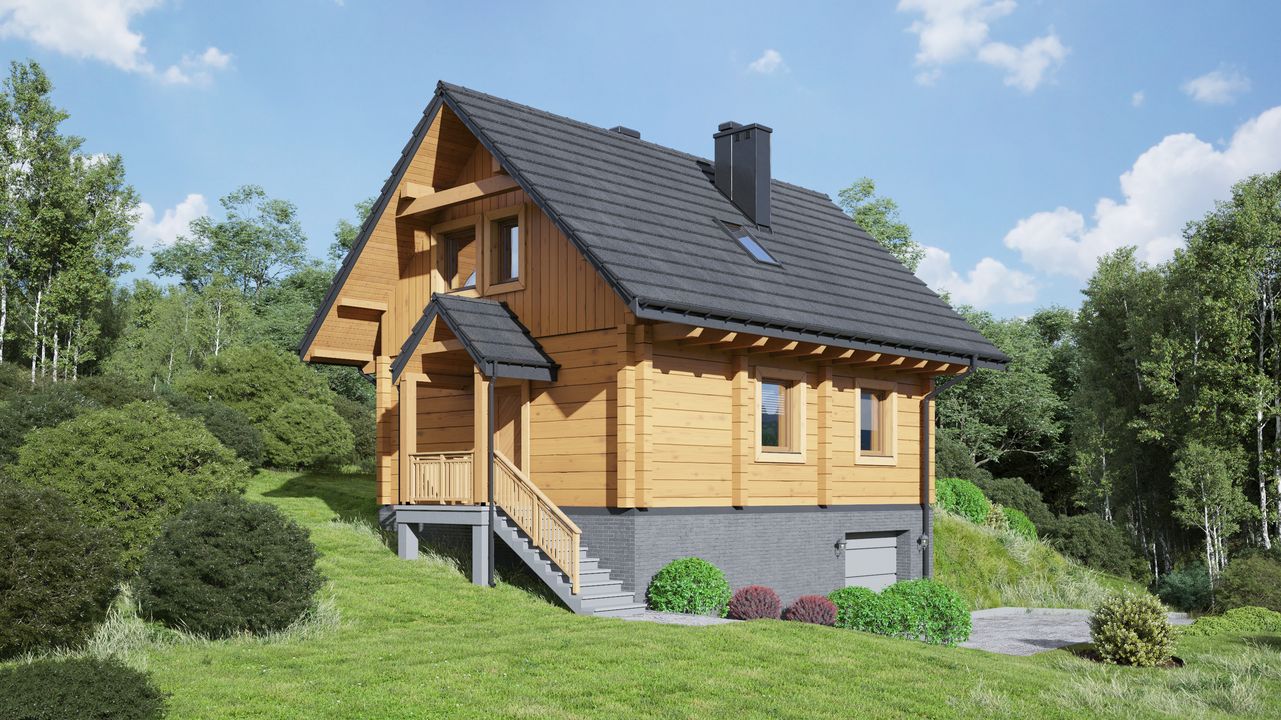 Graficzne opracowanie rzutów poglądowych widocznych na karcie projektu zostało wykonane przez Extradom.pl. Prezentowane przez Extradom.pl wizualizacje wykonane zostały przez autora projektu i należy poczytywać je jedynie za przykład i propozycję wykończenia, wizję architektoniczną autora projektu. Ostateczne wykończenie budynku może nastąpić na wiele sposobów. Szczegółowe rozwiązania zastosowane w oferowanej dokumentacji - w tym również ilość, lokalizacje i wygląd okien, drzwi, kominów - mogą w niewielkim stopniu różnić się od prezentowanej wizualizacji budynku.