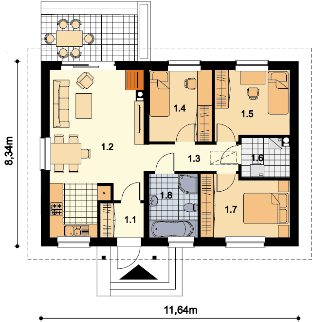 Graficzne opracowanie rzutów poglądowych widocznych na karcie projektu zostało wykonane przez Extradom.pl. Prezentowane przez Extradom.pl wizualizacje wykonane zostały przez autora projektu i należy poczytywać je jedynie za przykład i propozycję wykończenia, wizję architektoniczną autora projektu. Ostateczne wykończenie budynku może nastąpić na wiele sposobów. Szczegółowe rozwiązania zastosowane w oferowanej dokumentacji - w tym również ilość, lokalizacje i wygląd okien, drzwi, kominów - mogą w niewielkim stopniu różnić się od prezentowanej wizualizacji budynku.