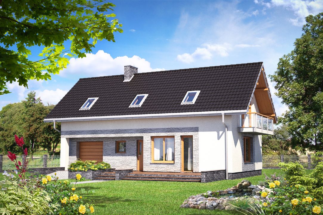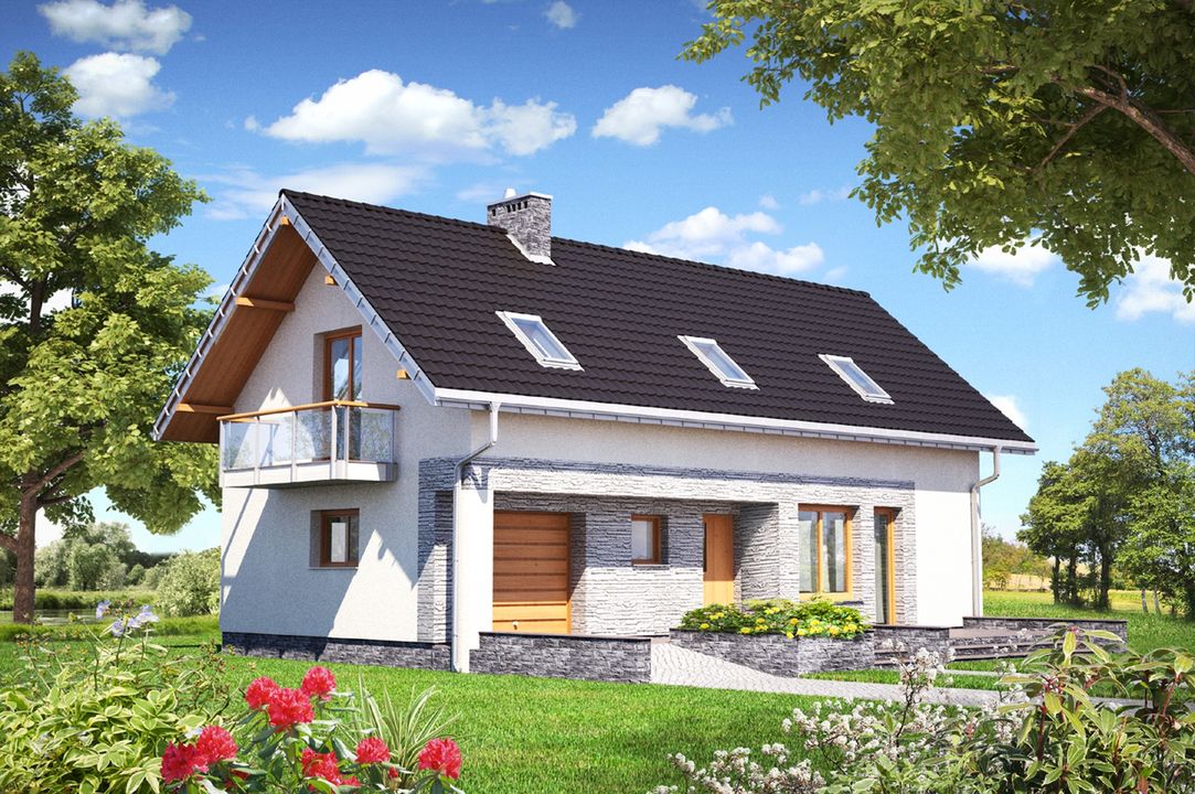 Graficzne opracowanie rzutów poglądowych widocznych na karcie projektu zostało wykonane przez Extradom.pl. Prezentowane przez Extradom.pl wizualizacje wykonane zostały przez autora projektu i należy poczytywać je jedynie za przykład i propozycję wykończenia, wizję architektoniczną autora projektu. Ostateczne wykończenie budynku może nastąpić na wiele sposobów. Szczegółowe rozwiązania zastosowane w oferowanej dokumentacji - w tym również ilość, lokalizacje i wygląd okien, drzwi, kominów - mogą w niewielkim stopniu różnić się od prezentowanej wizualizacji budynku.