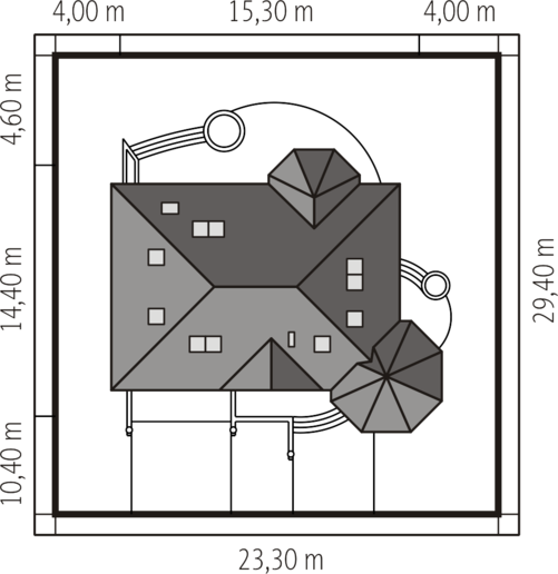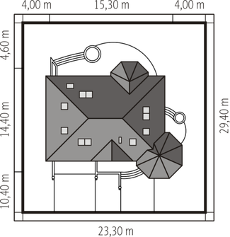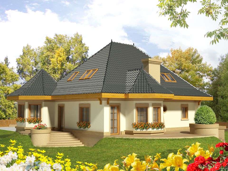 Graficzne opracowanie rzutów poglądowych widocznych na karcie projektu zostało wykonane przez Extradom.pl. Prezentowane przez Extradom.pl wizualizacje wykonane zostały przez autora projektu i należy poczytywać je jedynie za przykład i propozycję wykończenia, wizję architektoniczną autora projektu. Ostateczne wykończenie budynku może nastąpić na wiele sposobów. Szczegółowe rozwiązania zastosowane w oferowanej dokumentacji - w tym również ilość, lokalizacje i wygląd okien, drzwi, kominów - mogą w niewielkim stopniu różnić się od prezentowanej wizualizacji budynku.