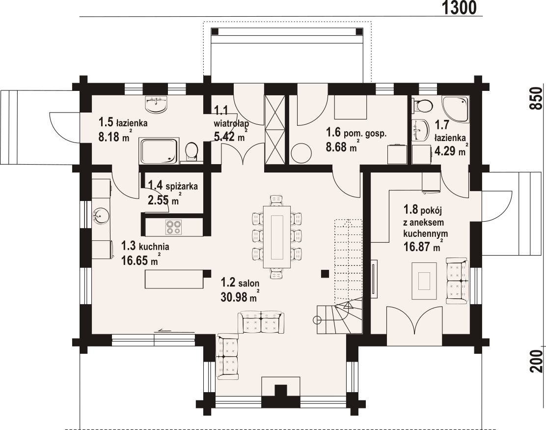 Wysokość ścianki kolankowej: 1.08 m. Strop: drewniany. Pokrycie dachu: dachówka gontopodobna Gerard Corona. Ściany zewnętrzne: płazy drewniane. Ściany wewnętrzne: płazy drewniane. Typ ogrzewania: kocioł gazowy. Instalacje dodatkowe: pompa ciepła. Inne: okna dachowe Fakro Greenview.