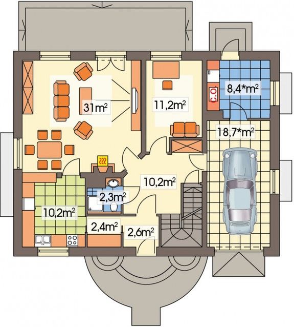 Graficzne opracowanie rzutów poglądowych widocznych na karcie projektu zostało wykonane przez Extradom.pl. Prezentowane przez Extradom.pl wizualizacje wykonane zostały przez autora projektu i należy poczytywać je jedynie za przykład i propozycję wykończenia, wizję architektoniczną autora projektu. Ostateczne wykończenie budynku może nastąpić na wiele sposobów. Szczegółowe rozwiązania zastosowane w oferowanej dokumentacji - w tym również ilość, lokalizacje i wygląd okien, drzwi, kominów - mogą w niewielkim stopniu różnić się od prezentowanej wizualizacji budynku.