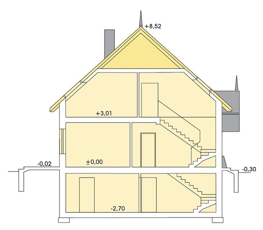 Strop: gęstożebrowy Teriva I. Ściany zewnętrzne: gazobeton 24cm + styropian 20cm. Pokrycie dachowe: dachówka ceramiczna. Okna połaciowe: Velux.