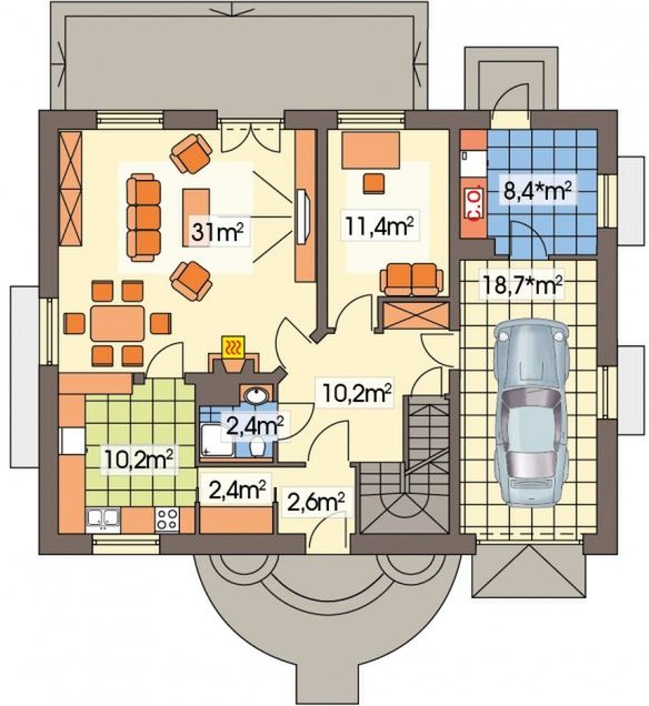 Graficzne opracowanie rzutów poglądowych widocznych na karcie projektu zostało wykonane przez Extradom.pl. Prezentowane przez Extradom.pl wizualizacje wykonane zostały przez autora projektu i należy poczytywać je jedynie za przykład i propozycję wykończenia, wizję architektoniczną autora projektu. Ostateczne wykończenie budynku może nastąpić na wiele sposobów. Szczegółowe rozwiązania zastosowane w oferowanej dokumentacji - w tym również ilość, lokalizacje i wygląd okien, drzwi, kominów - mogą w niewielkim stopniu różnić się od prezentowanej wizualizacji budynku.
