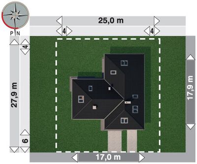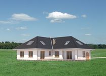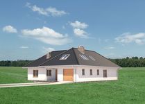 Graficzne opracowanie rzutów poglądowych widocznych na karcie projektu zostało wykonane przez Extradom.pl. Prezentowane przez Extradom.pl wizualizacje wykonane zostały przez autora projektu i należy poczytywać je jedynie za przykład i propozycję wykończenia, wizję architektoniczną autora projektu. Ostateczne wykończenie budynku może nastąpić na wiele sposobów. Szczegółowe rozwiązania zastosowane w oferowanej dokumentacji - w tym również ilość, lokalizacje i wygląd okien, drzwi, kominów - mogą w niewielkim stopniu różnić się od prezentowanej wizualizacji budynku.