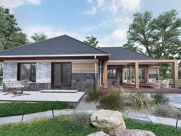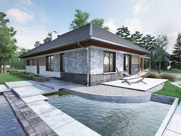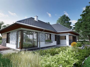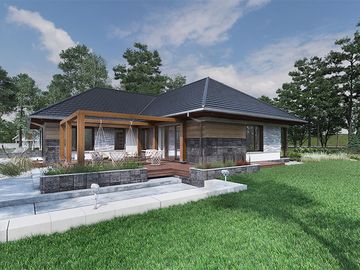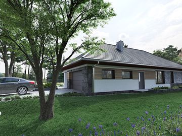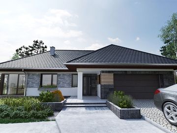 Graficzne opracowanie rzutów poglądowych widocznych na karcie projektu zostało wykonane przez Extradom.pl. Prezentowane przez Extradom.pl wizualizacje wykonane zostały przez autora projektu i należy poczytywać je jedynie za przykład i propozycję wykończenia, wizję architektoniczną autora projektu. Ostateczne wykończenie budynku może nastąpić na wiele sposobów. Szczegółowe rozwiązania zastosowane w oferowanej dokumentacji - w tym również ilość, lokalizacje i wygląd okien, drzwi, kominów - mogą w niewielkim stopniu różnić się od prezentowanej wizualizacji budynku.