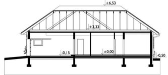 Graficzne opracowanie rzutów poglądowych widocznych na karcie projektu zostało wykonane przez Extradom.pl. Prezentowane przez Extradom.pl wizualizacje wykonane zostały przez autora projektu i należy poczytywać je jedynie za przykład i propozycję wykończenia, wizję architektoniczną autora projektu. Ostateczne wykończenie budynku może nastąpić na wiele sposobów. Szczegółowe rozwiązania zastosowane w oferowanej dokumentacji - w tym również ilość, lokalizacje i wygląd okien, drzwi, kominów - mogą w niewielkim stopniu różnić się od prezentowanej wizualizacji budynku.