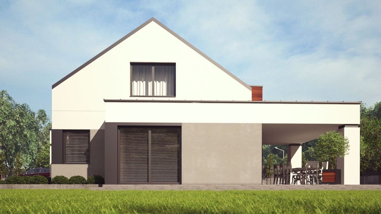 Graficzne opracowanie rzutów poglądowych widocznych na karcie projektu zostało wykonane przez Extradom.pl. Prezentowane przez Extradom.pl wizualizacje wykonane zostały przez autora projektu i należy poczytywać je jedynie za przykład i propozycję wykończenia, wizję architektoniczną autora projektu. Ostateczne wykończenie budynku może nastąpić na wiele sposobów. Szczegółowe rozwiązania zastosowane w oferowanej dokumentacji - w tym również ilość, lokalizacje i wygląd okien, drzwi, kominów - mogą w niewielkim stopniu różnić się od prezentowanej wizualizacji budynku.