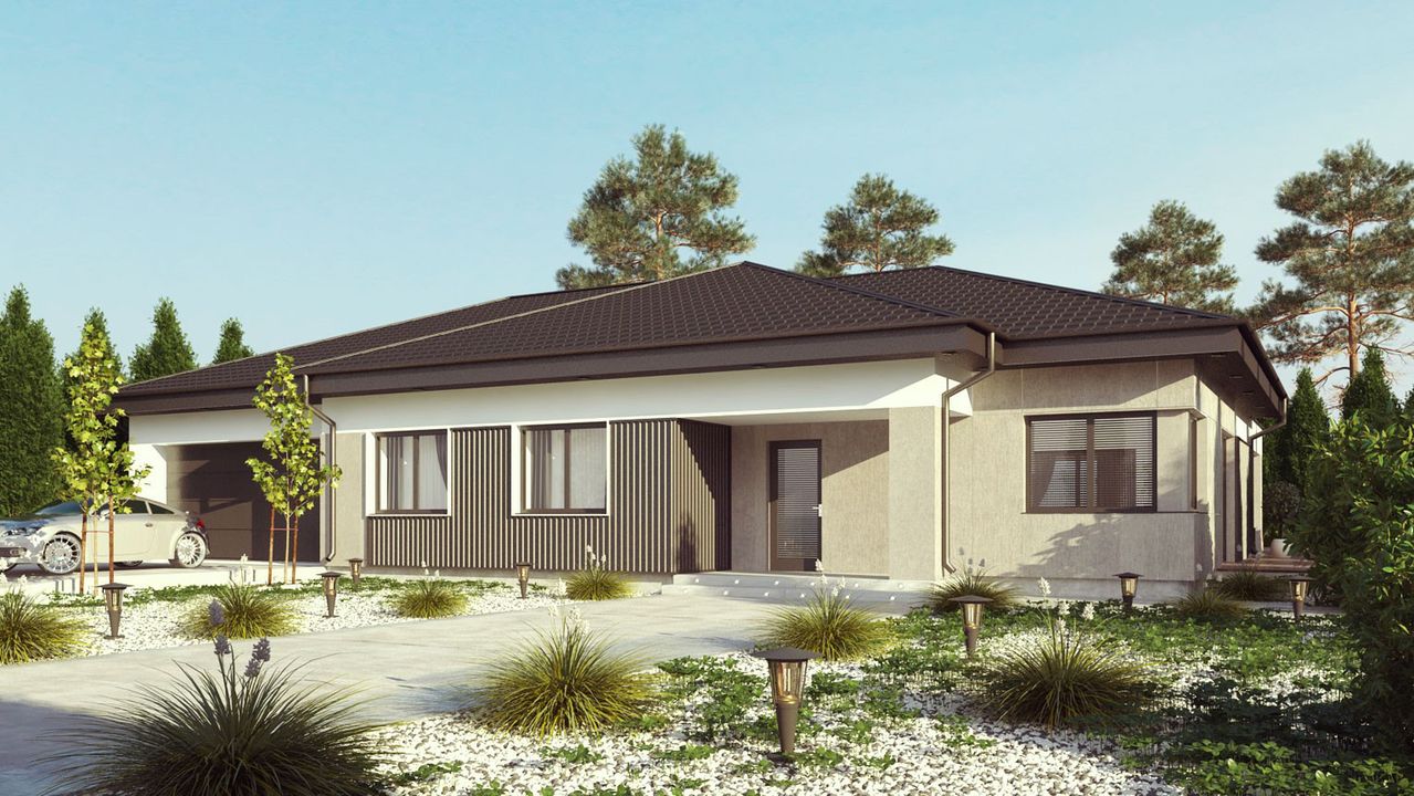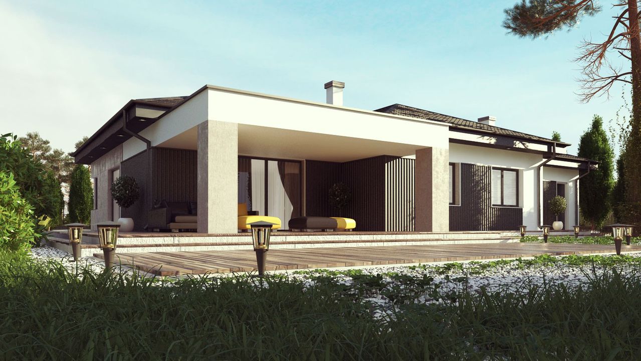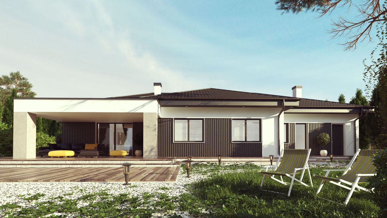 Graficzne opracowanie rzutów poglądowych widocznych na karcie projektu zostało wykonane przez Extradom.pl. Prezentowane przez Extradom.pl wizualizacje wykonane zostały przez autora projektu i należy poczytywać je jedynie za przykład i propozycję wykończenia, wizję architektoniczną autora projektu. Ostateczne wykończenie budynku może nastąpić na wiele sposobów. Szczegółowe rozwiązania zastosowane w oferowanej dokumentacji - w tym również ilość, lokalizacje i wygląd okien, drzwi, kominów - mogą w niewielkim stopniu różnić się od prezentowanej wizualizacji budynku.