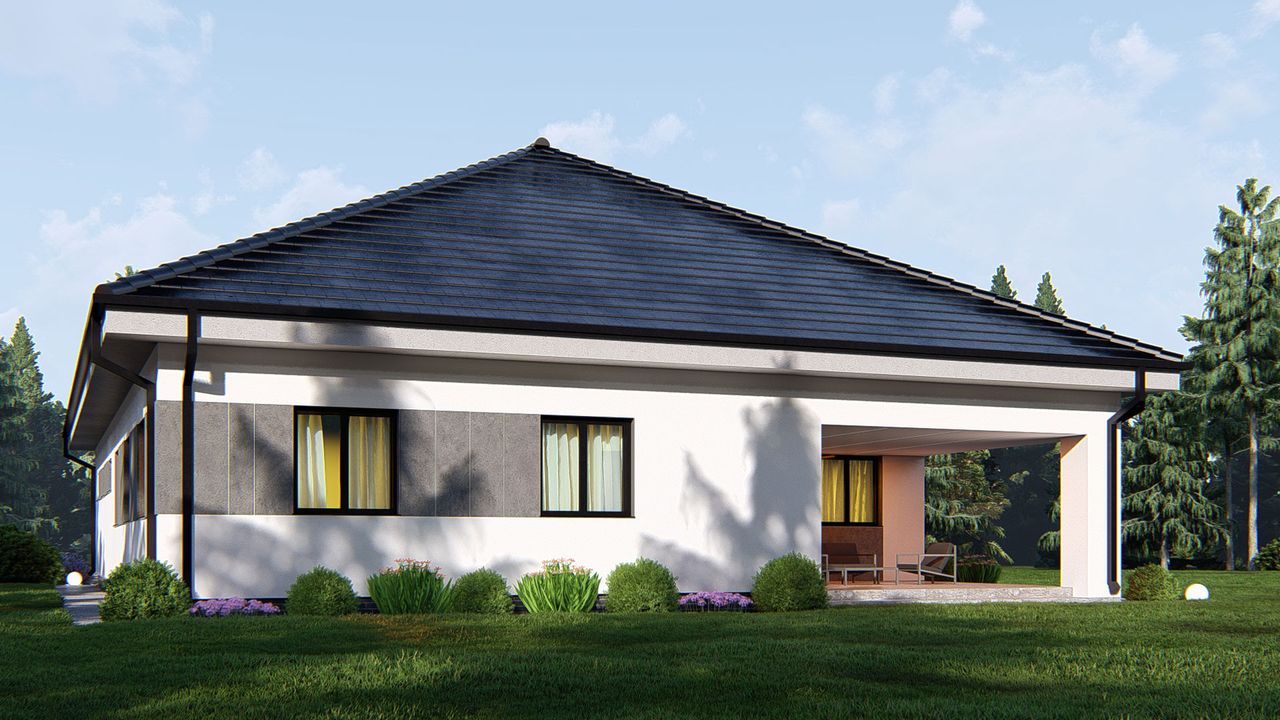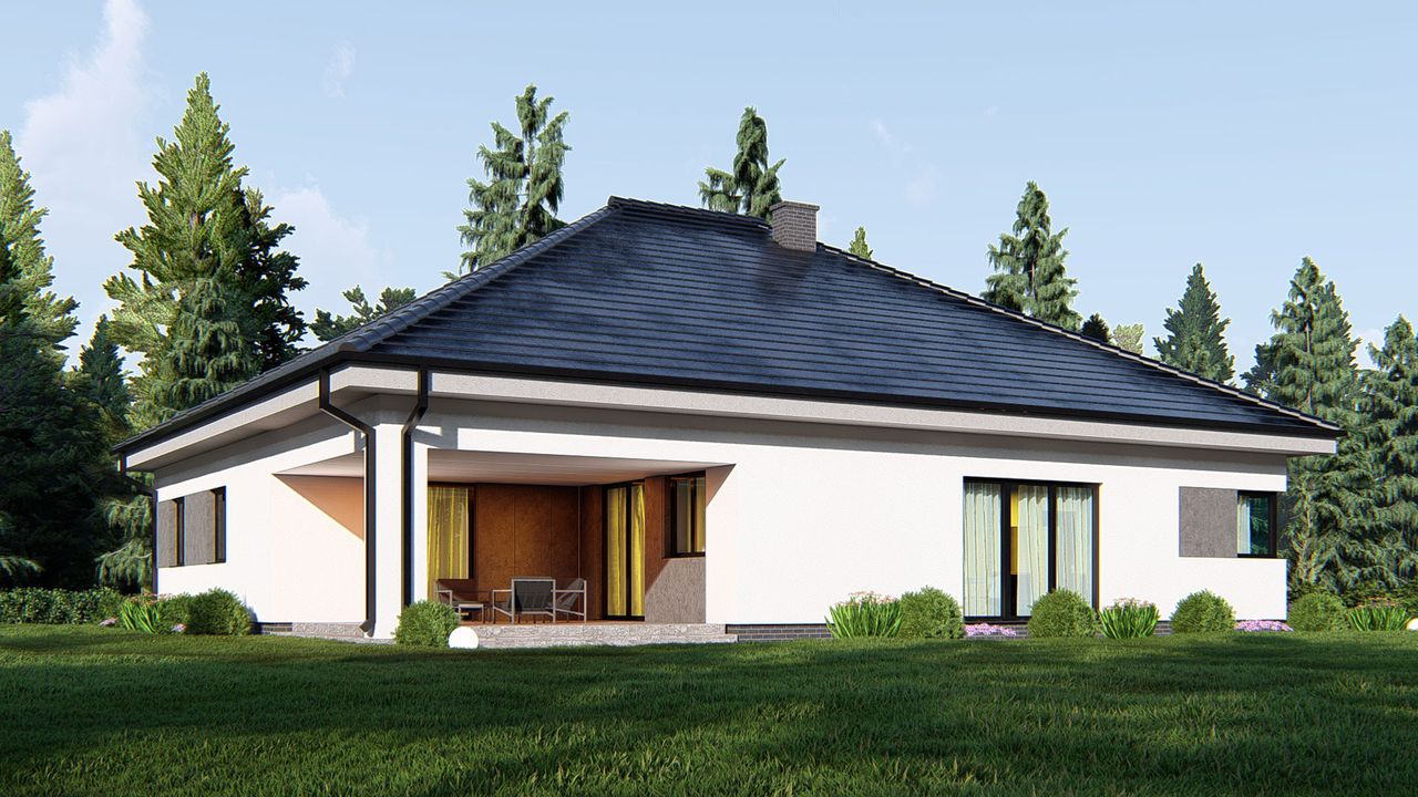 Graficzne opracowanie rzutów poglądowych widocznych na karcie projektu zostało wykonane przez Extradom.pl. Prezentowane przez Extradom.pl wizualizacje wykonane zostały przez autora projektu i należy poczytywać je jedynie za przykład i propozycję wykończenia, wizję architektoniczną autora projektu. Ostateczne wykończenie budynku może nastąpić na wiele sposobów. Szczegółowe rozwiązania zastosowane w oferowanej dokumentacji - w tym również ilość, lokalizacje i wygląd okien, drzwi, kominów - mogą w niewielkim stopniu różnić się od prezentowanej wizualizacji budynku.