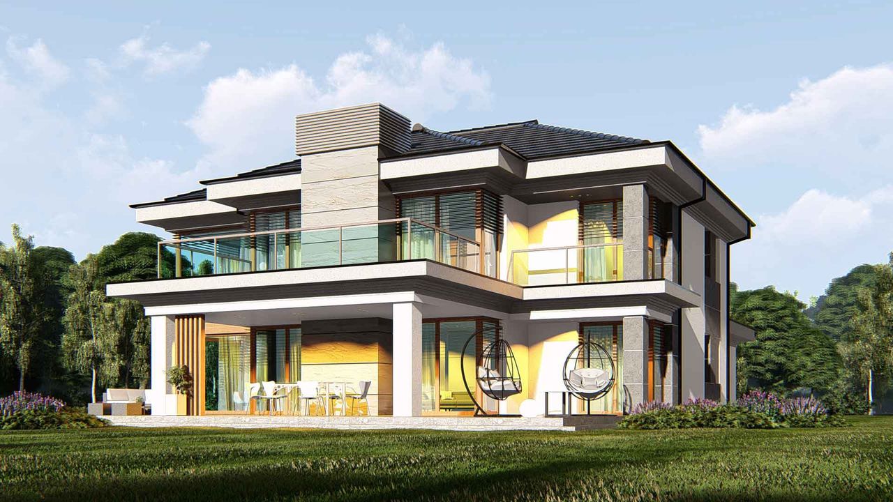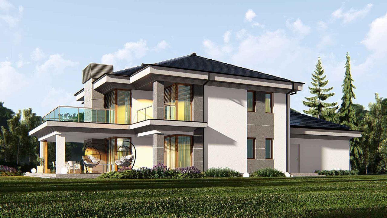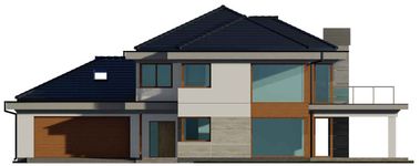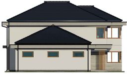Graficzne opracowanie rzutów poglądowych widocznych na karcie projektu zostało wykonane przez Extradom.pl. Prezentowane przez Extradom.pl wizualizacje wykonane zostały przez autora projektu i należy poczytywać je jedynie za przykład i propozycję wykończenia, wizję architektoniczną autora projektu. Ostateczne wykończenie budynku może nastąpić na wiele sposobów. Szczegółowe rozwiązania zastosowane w oferowanej dokumentacji - w tym również ilość, lokalizacje i wygląd okien, drzwi, kominów - mogą w niewielkim stopniu różnić się od prezentowanej wizualizacji budynku.