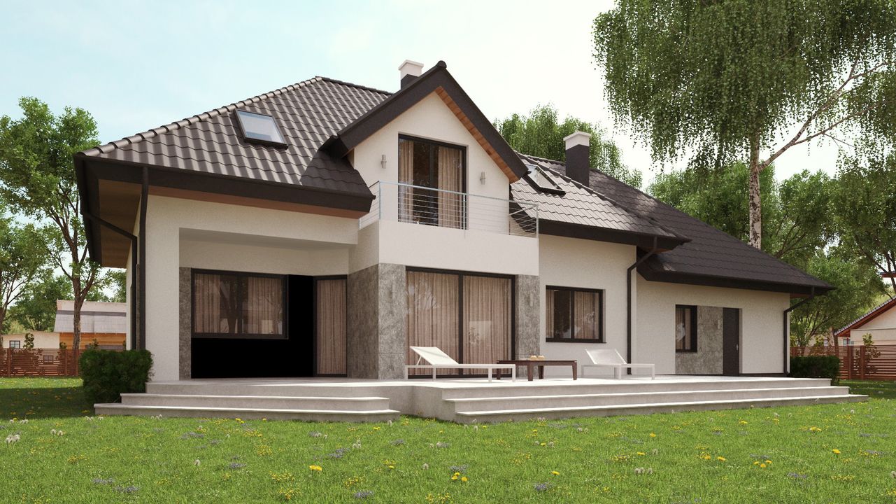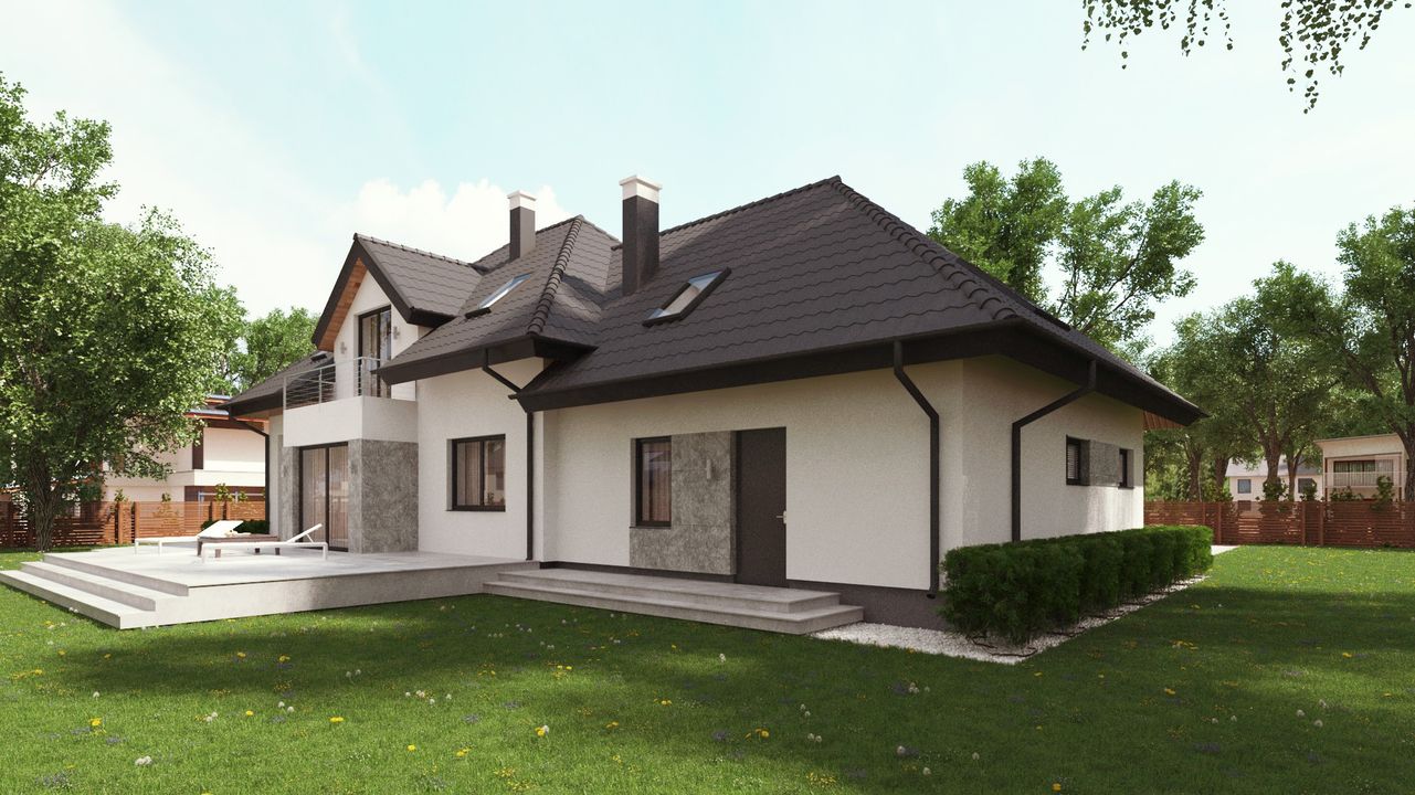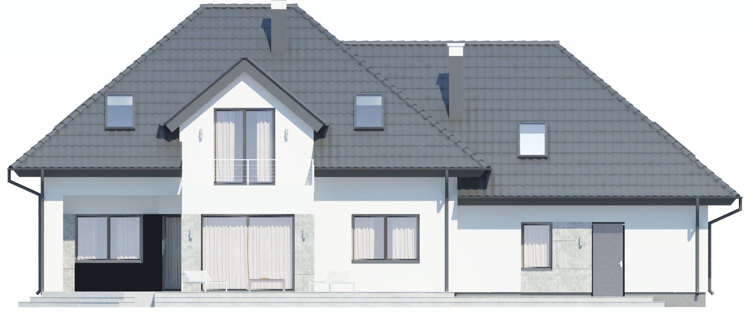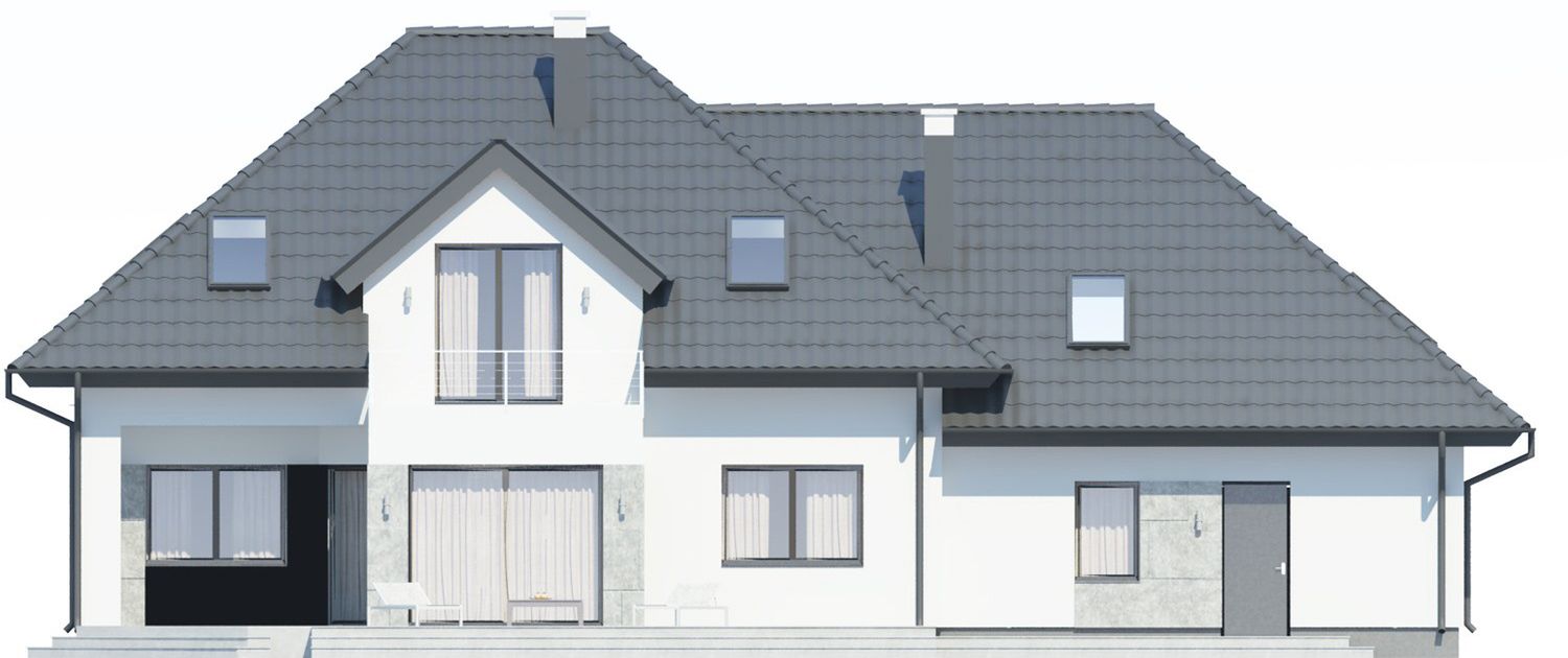 Graficzne opracowanie rzutów poglądowych widocznych na karcie projektu zostało wykonane przez Extradom.pl. Prezentowane przez Extradom.pl wizualizacje wykonane zostały przez autora projektu i należy poczytywać je jedynie za przykład i propozycję wykończenia, wizję architektoniczną autora projektu. Ostateczne wykończenie budynku może nastąpić na wiele sposobów. Szczegółowe rozwiązania zastosowane w oferowanej dokumentacji - w tym również ilość, lokalizacje i wygląd okien, drzwi, kominów - mogą w niewielkim stopniu różnić się od prezentowanej wizualizacji budynku.