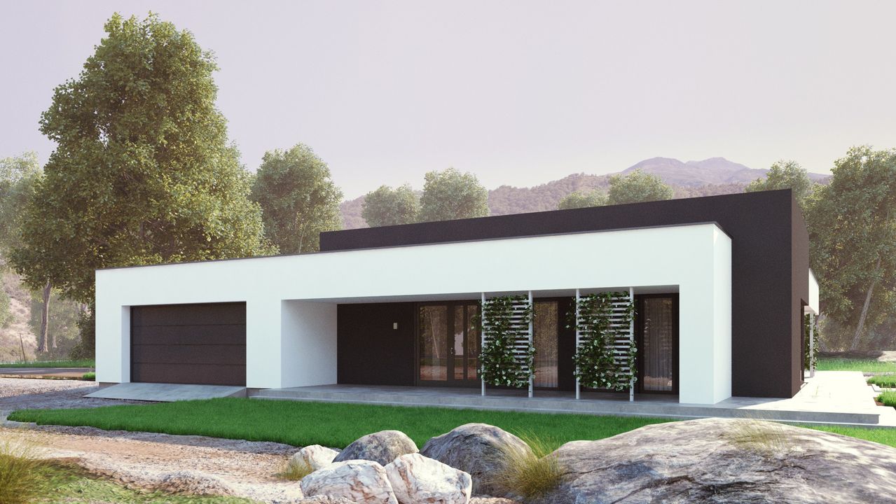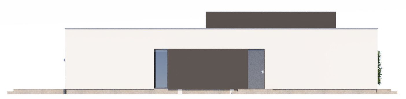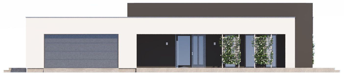 uA36 to kwintesencja nowoczesnego stylu w architekturze parterowej. Prosta, horyzontalna bryła z płaskim dachem i brakiem okapu podkreśla minimalistyczny charakter projektu. Elewacja łączy czysty biały tynk z kontrastowymi, ciemnymi płaszczyznami, co nadaje domowi elegancki i zdecydowany wyraz.