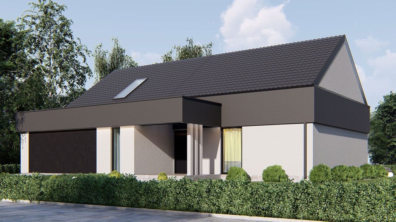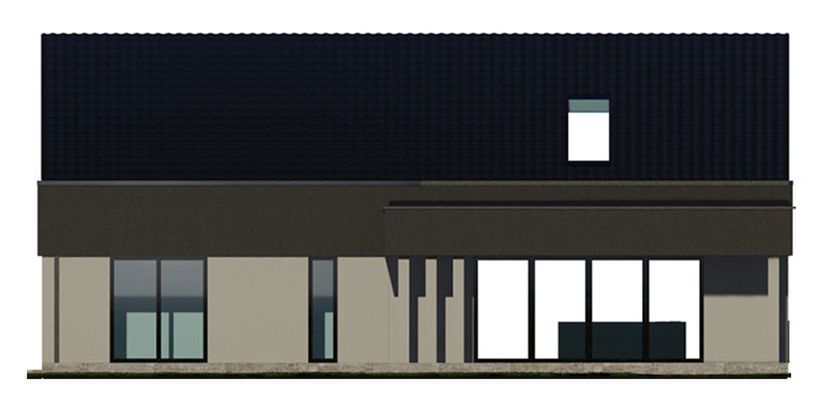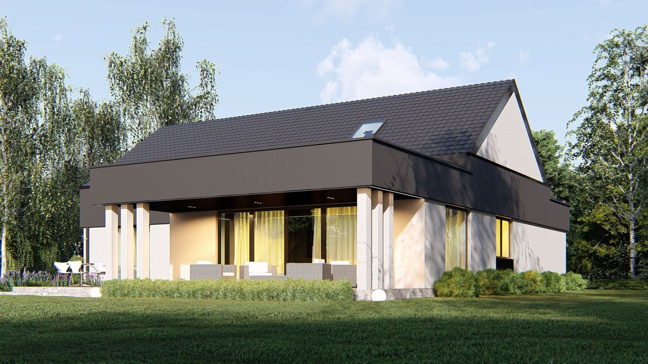 Graficzne opracowanie rzutów poglądowych widocznych na karcie projektu zostało wykonane przez Extradom.pl. Prezentowane przez Extradom.pl wizualizacje wykonane zostały przez autora projektu i należy poczytywać je jedynie za przykład i propozycję wykończenia, wizję architektoniczną autora projektu. Ostateczne wykończenie budynku może nastąpić na wiele sposobów. Szczegółowe rozwiązania zastosowane w oferowanej dokumentacji - w tym również ilość, lokalizacje i wygląd okien, drzwi, kominów - mogą w niewielkim stopniu różnić się od prezentowanej wizualizacji budynku.