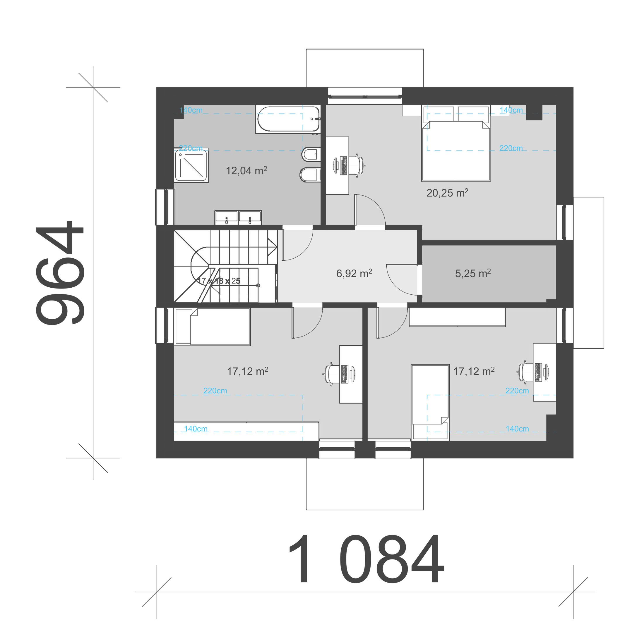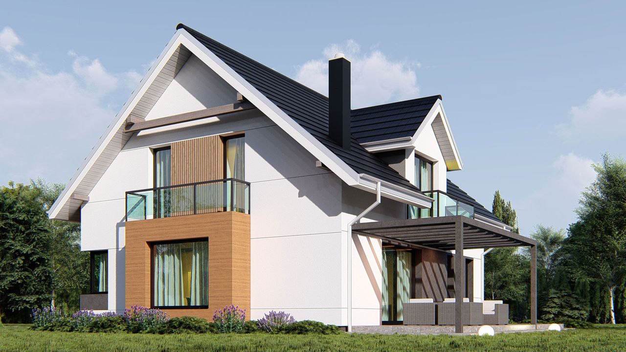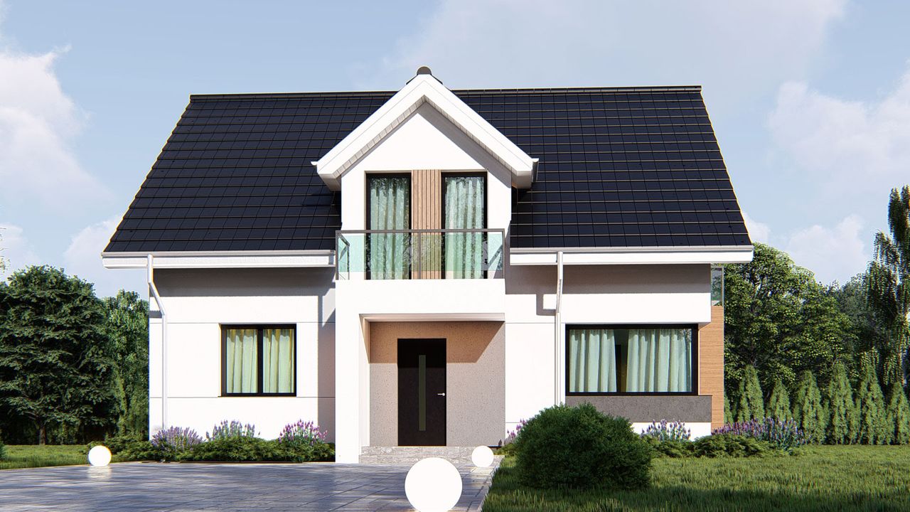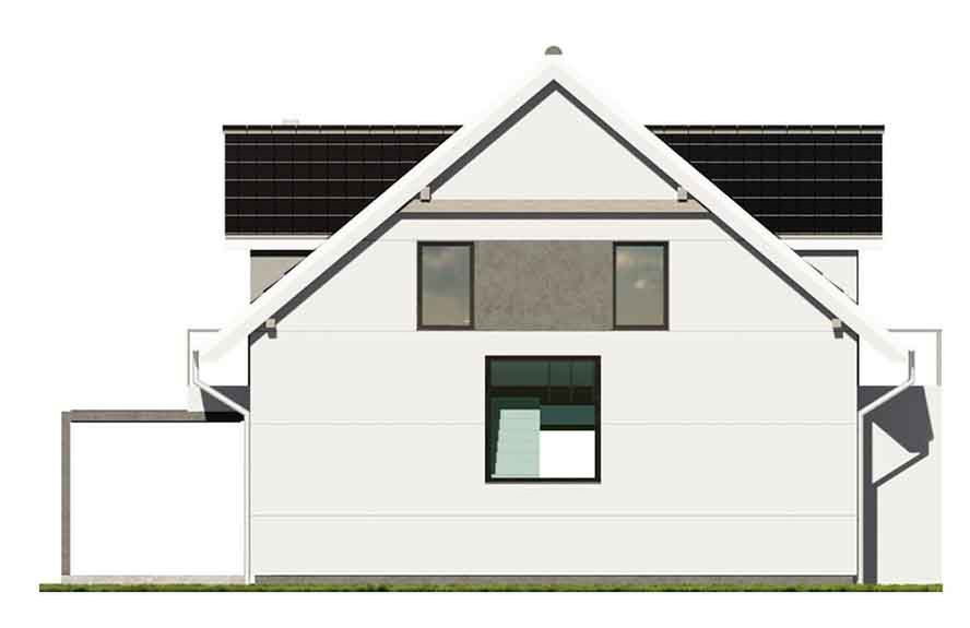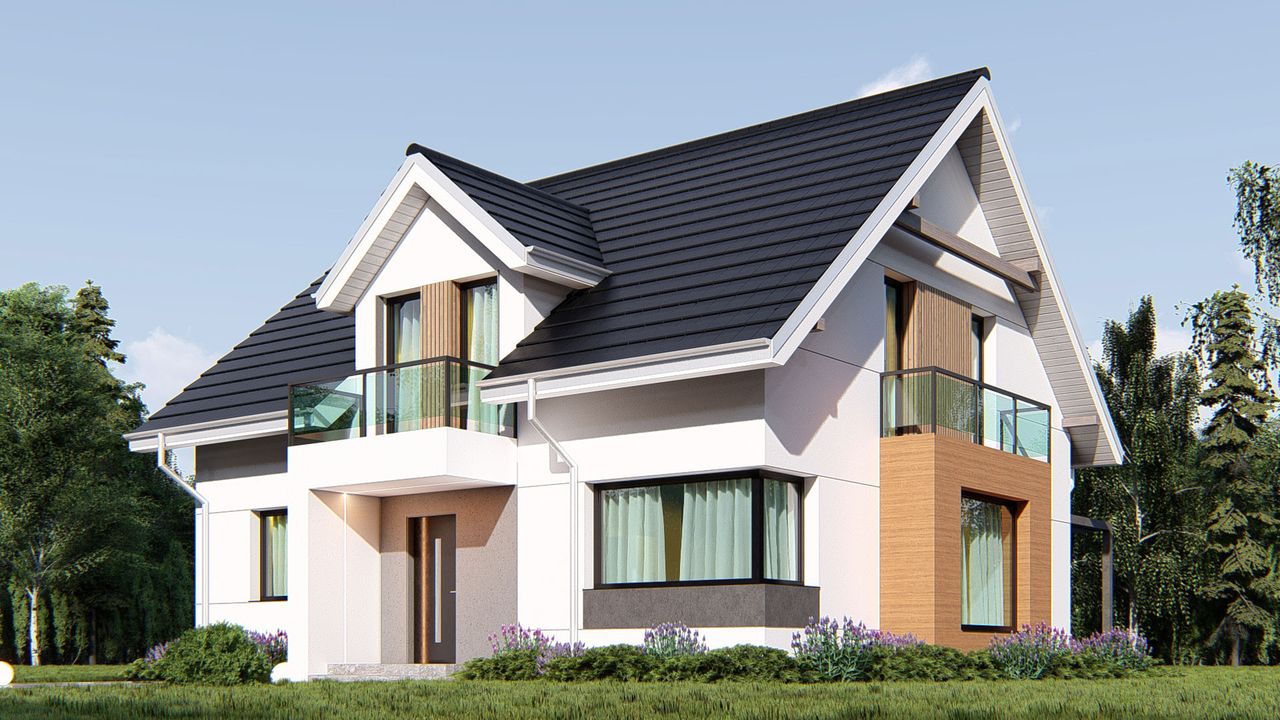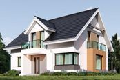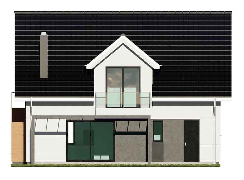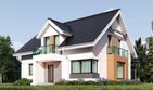 Graficzne opracowanie rzutów poglądowych widocznych na karcie projektu zostało wykonane przez Extradom.pl. Prezentowane przez Extradom.pl wizualizacje wykonane zostały przez autora projektu i należy poczytywać je jedynie za przykład i propozycję wykończenia, wizję architektoniczną autora projektu. Ostateczne wykończenie budynku może nastąpić na wiele sposobów. Szczegółowe rozwiązania zastosowane w oferowanej dokumentacji - w tym również ilość, lokalizacje i wygląd okien, drzwi, kominów - mogą w niewielkim stopniu różnić się od prezentowanej wizualizacji budynku.