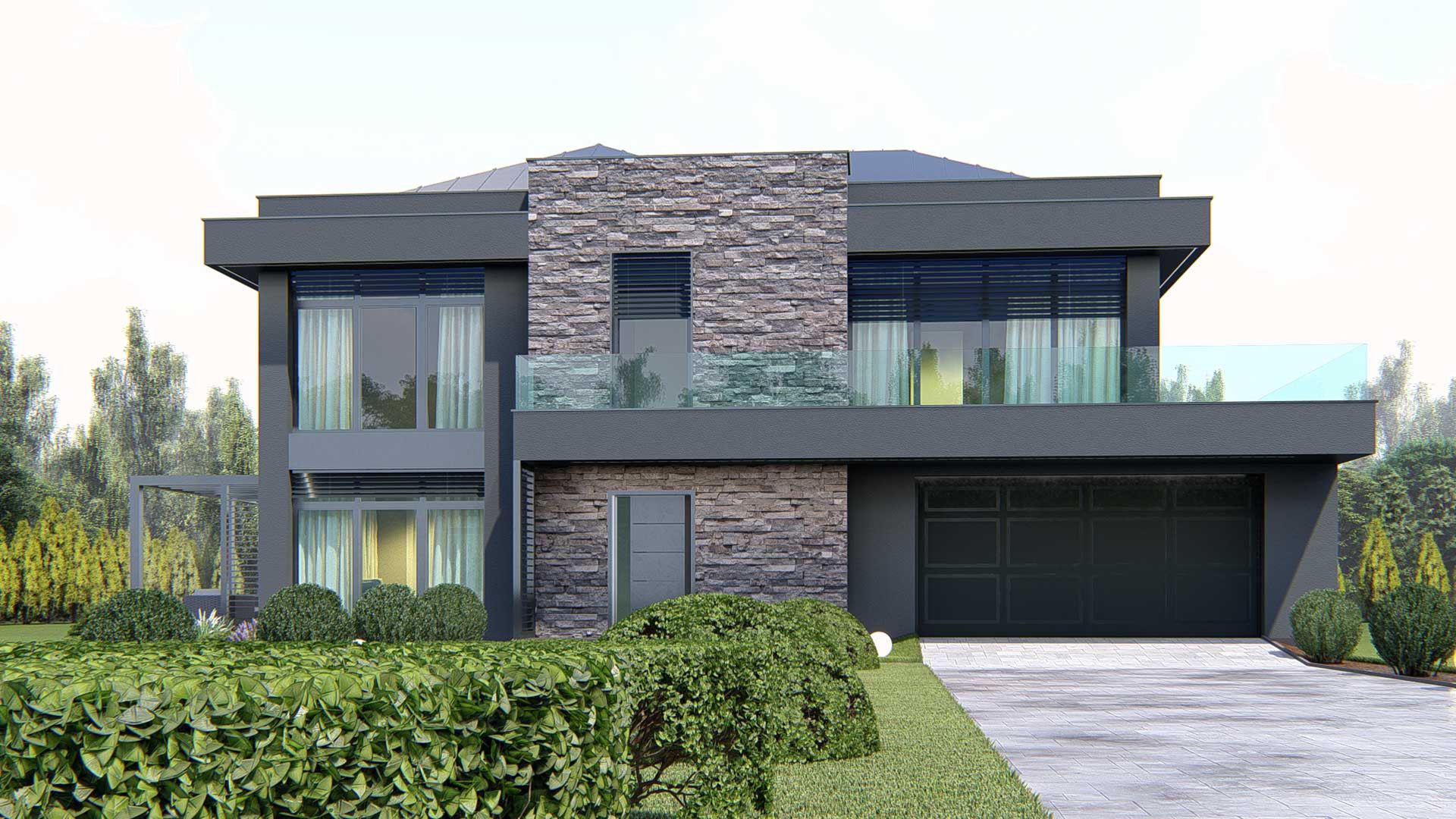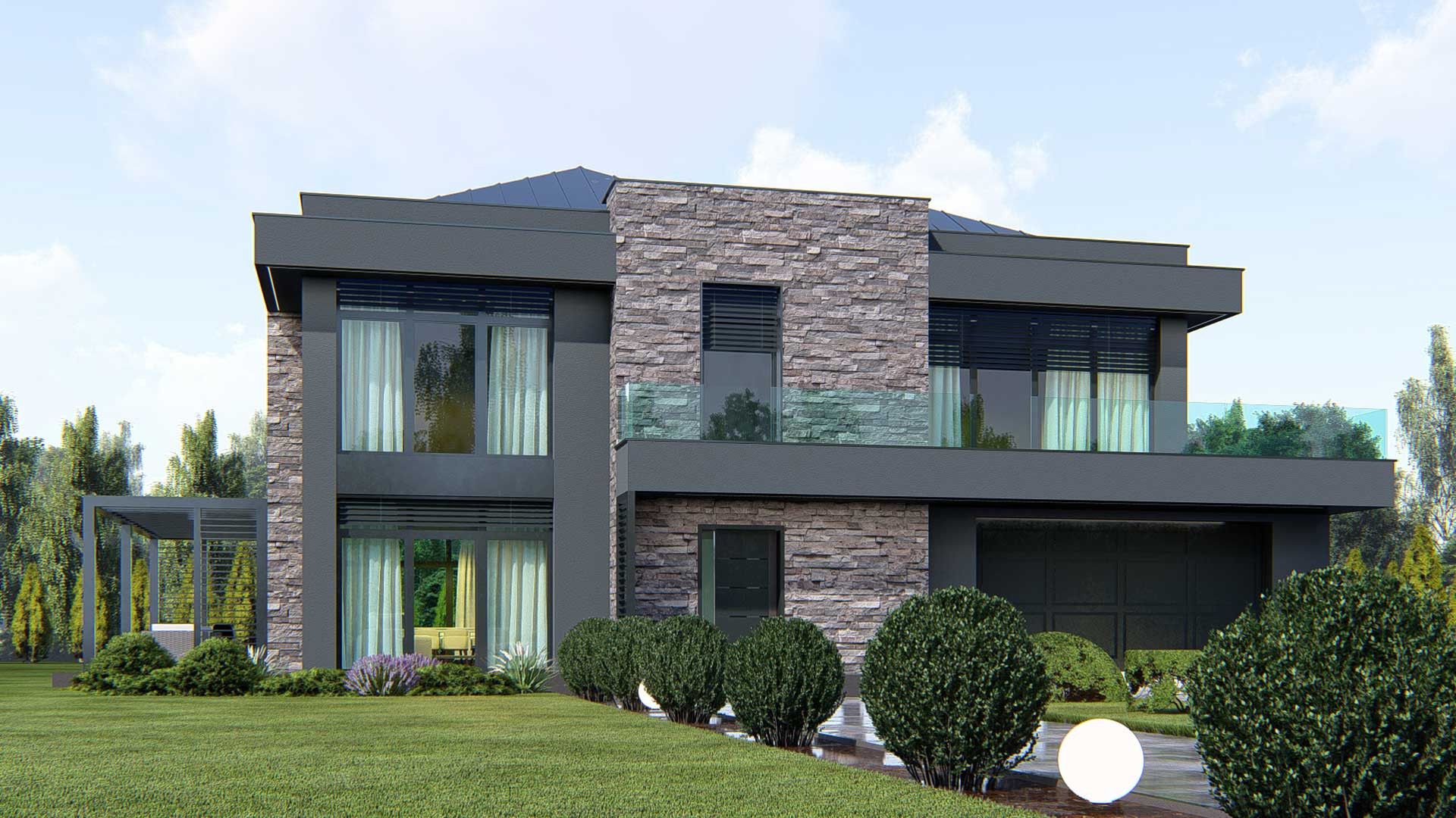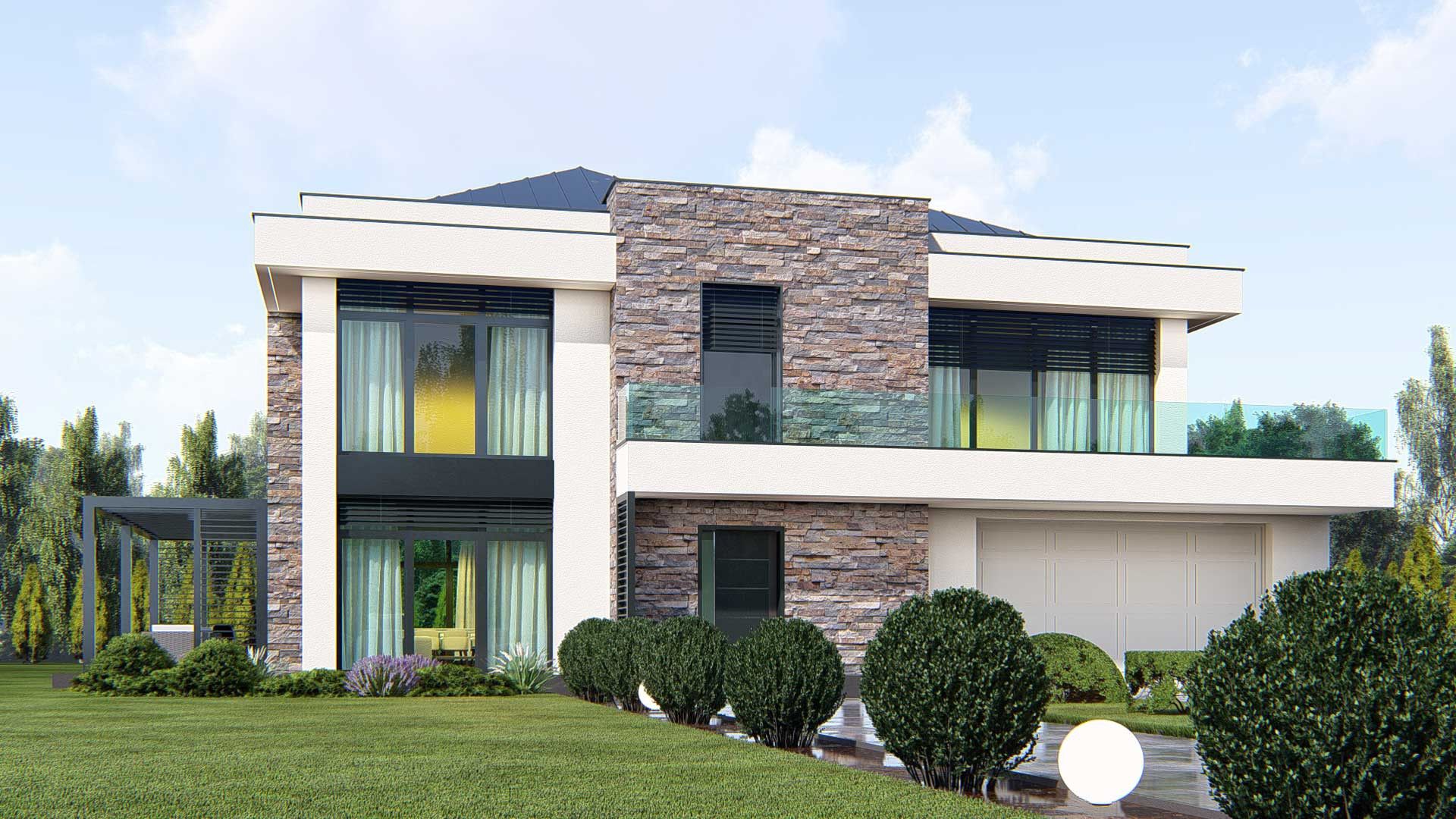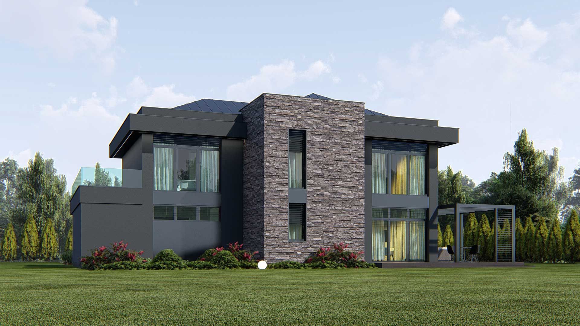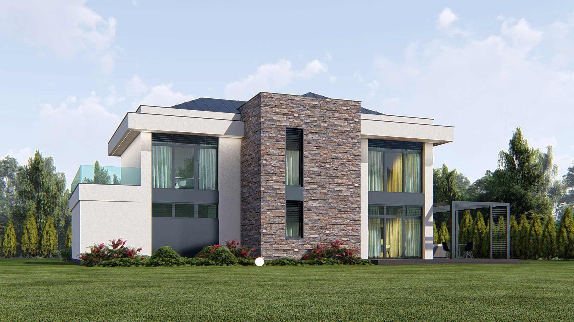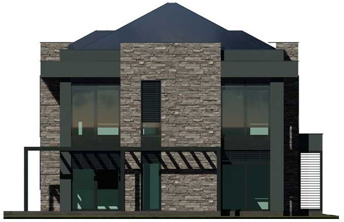 Graficzne opracowanie rzutów poglądowych widocznych na karcie projektu zostało wykonane przez Extradom.pl. Prezentowane przez Extradom.pl wizualizacje wykonane zostały przez autora projektu i należy poczytywać je jedynie za przykład i propozycję wykończenia, wizję architektoniczną autora projektu. Ostateczne wykończenie budynku może nastąpić na wiele sposobów. Szczegółowe rozwiązania zastosowane w oferowanej dokumentacji - w tym również ilość, lokalizacje i wygląd okien, drzwi, kominów - mogą w niewielkim stopniu różnić się od prezentowanej wizualizacji budynku.