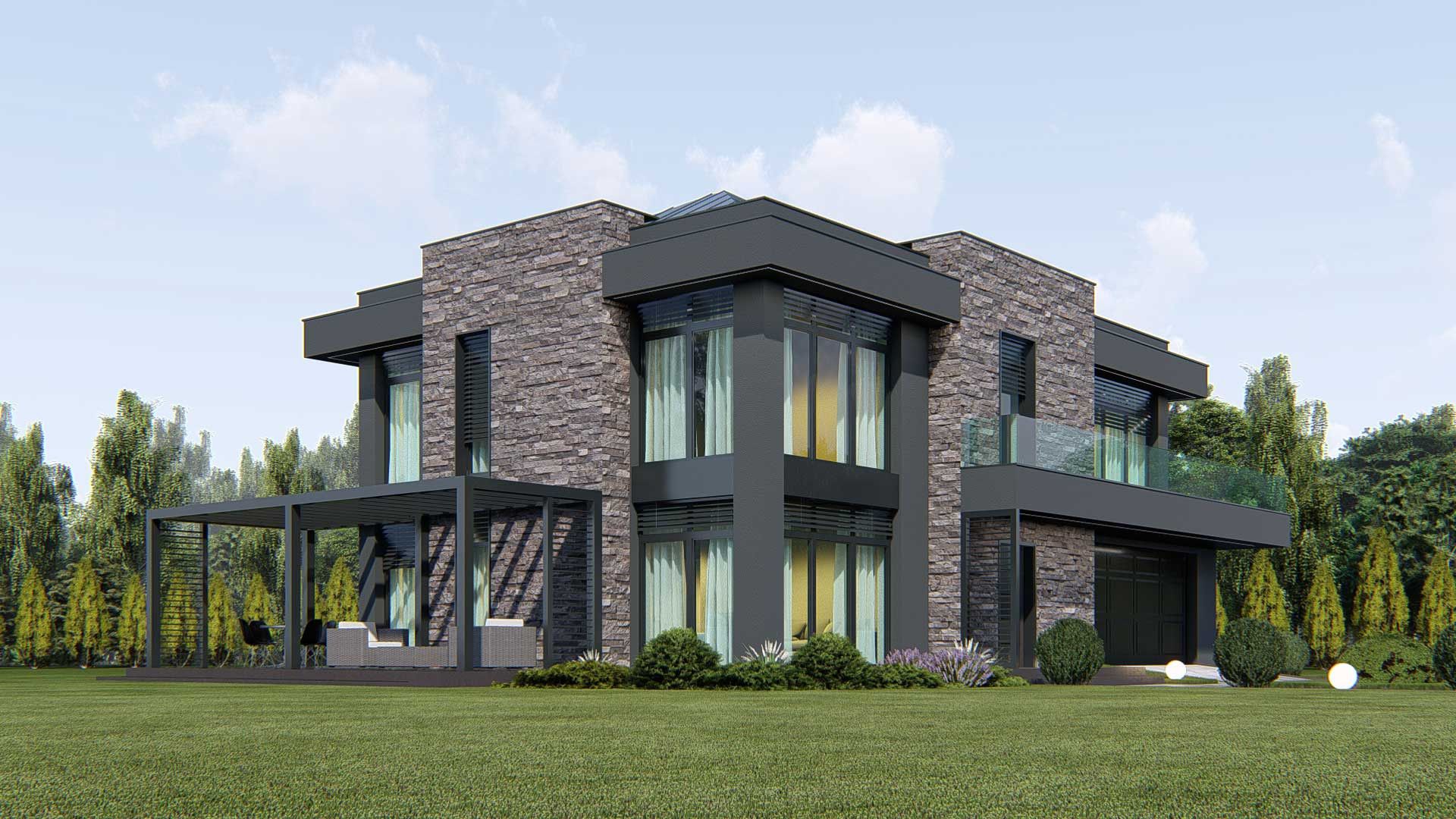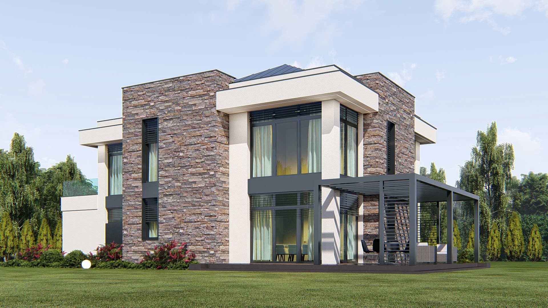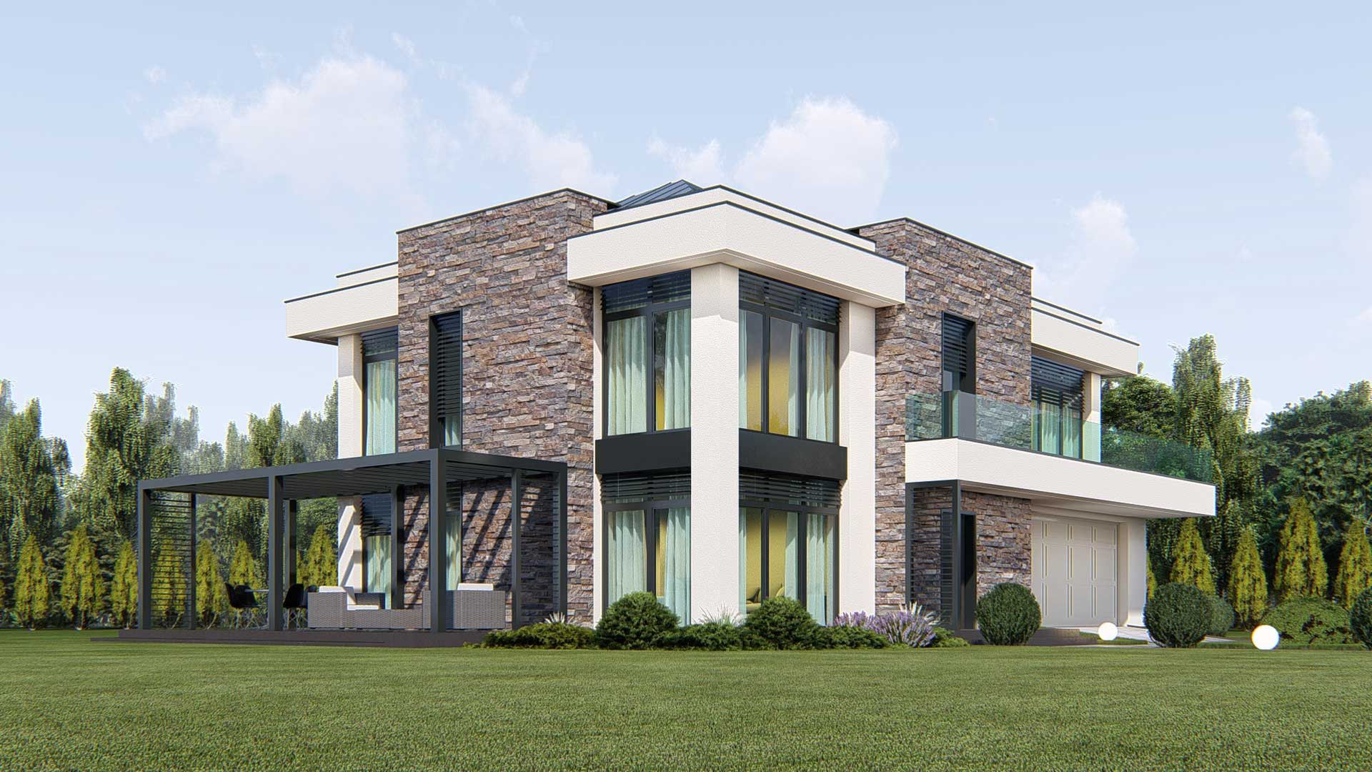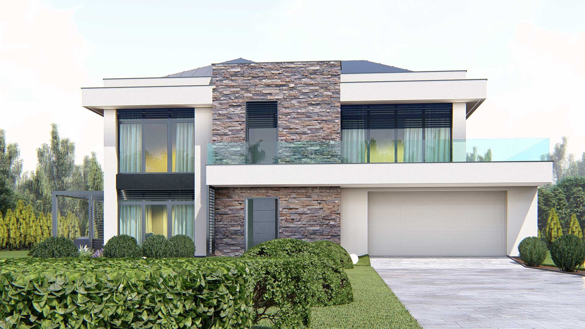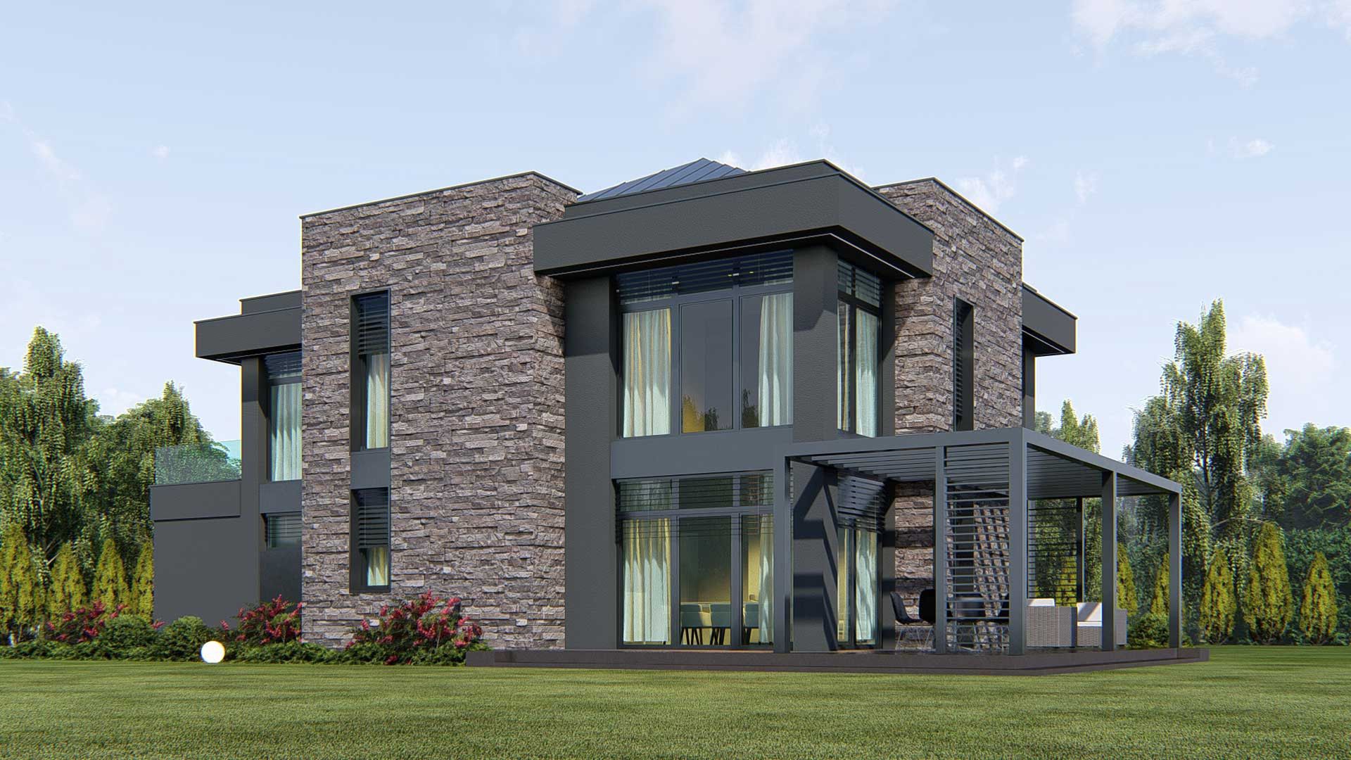Graficzne opracowanie rzutów poglądowych widocznych na karcie projektu zostało wykonane przez Extradom.pl. Prezentowane przez Extradom.pl wizualizacje wykonane zostały przez autora projektu i należy poczytywać je jedynie za przykład i propozycję wykończenia, wizję architektoniczną autora projektu. Ostateczne wykończenie budynku może nastąpić na wiele sposobów. Szczegółowe rozwiązania zastosowane w oferowanej dokumentacji - w tym również ilość, lokalizacje i wygląd okien, drzwi, kominów - mogą w niewielkim stopniu różnić się od prezentowanej wizualizacji budynku.
