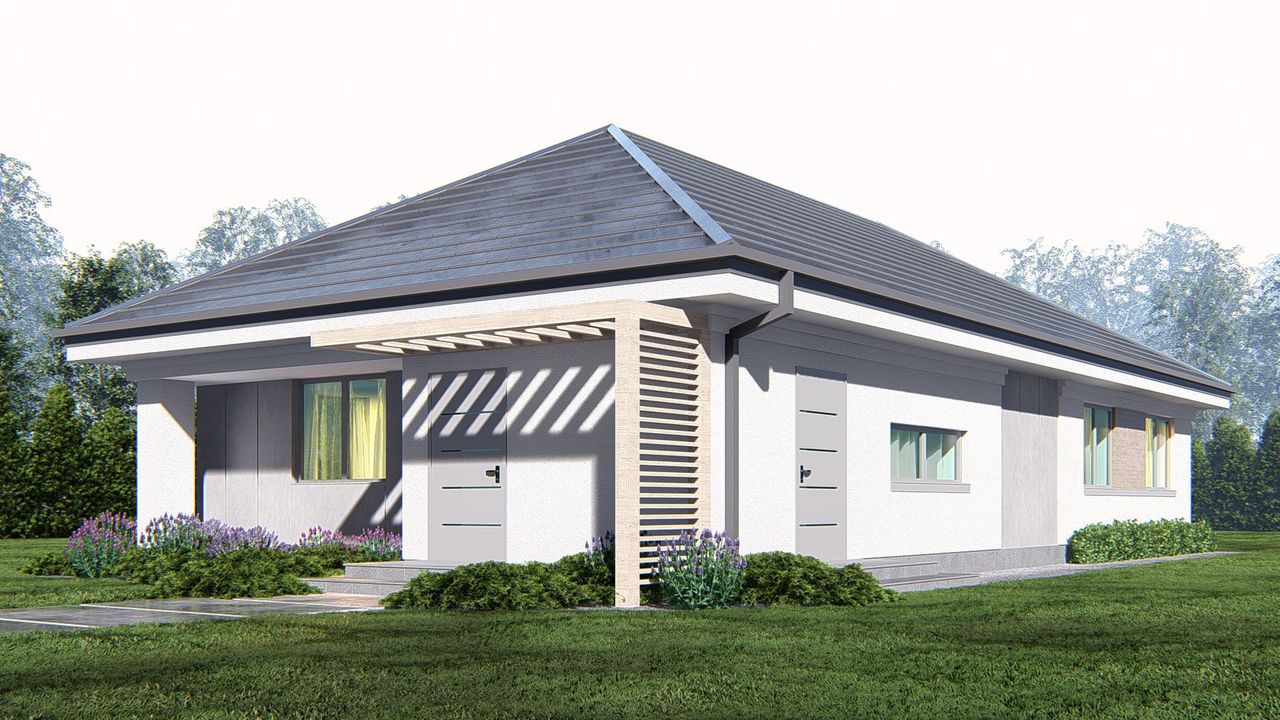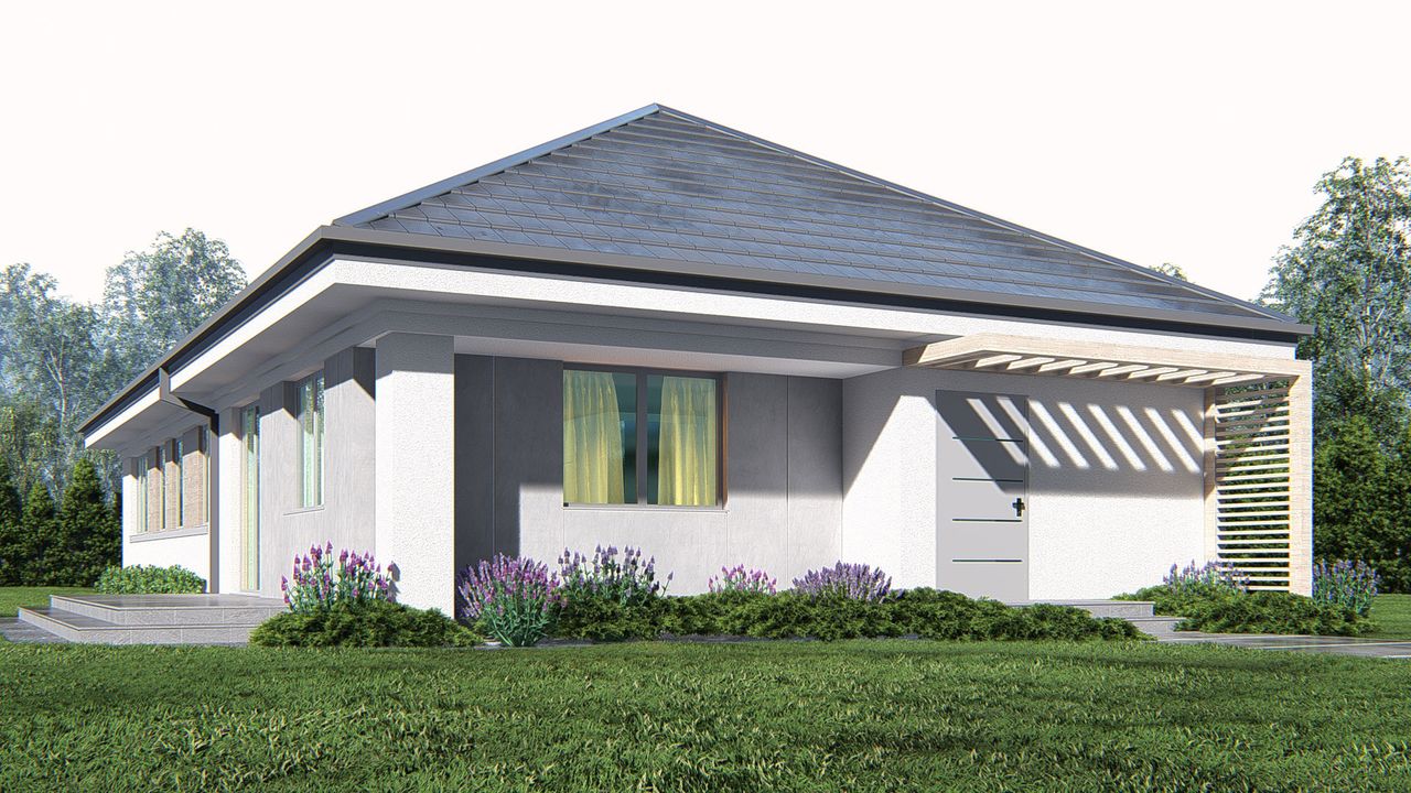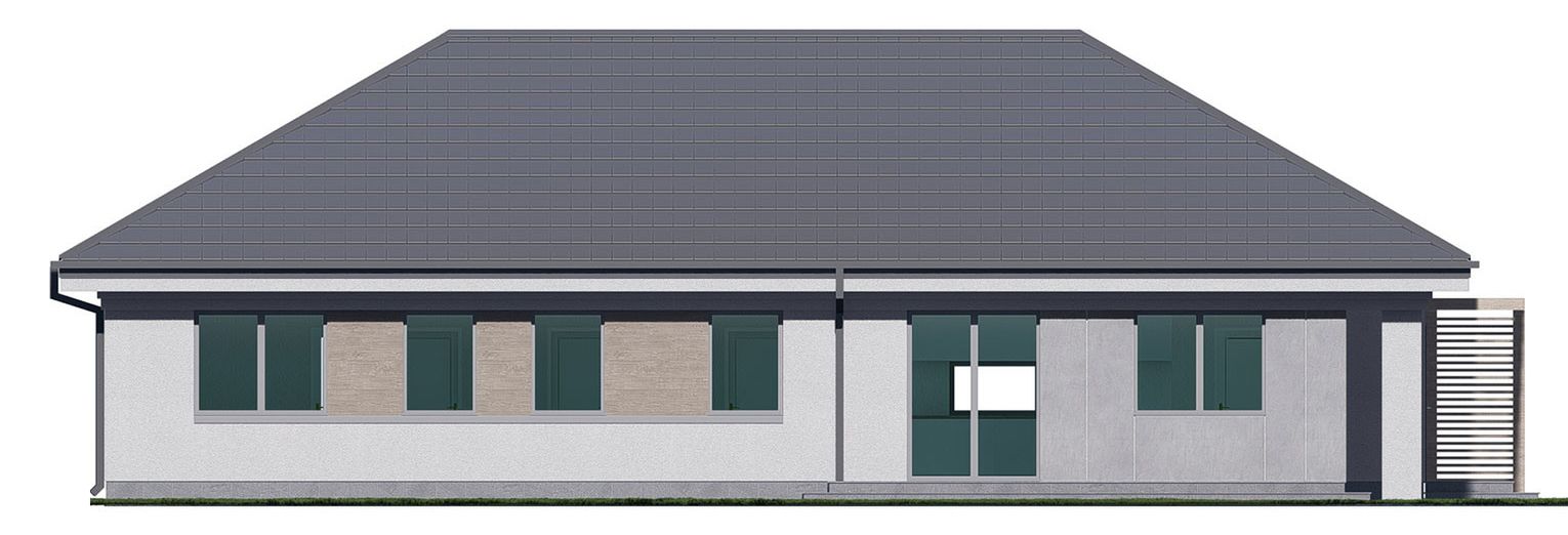 Graficzne opracowanie rzutów poglądowych widocznych na karcie projektu zostało wykonane przez Extradom.pl. Prezentowane przez Extradom.pl wizualizacje wykonane zostały przez autora projektu i należy poczytywać je jedynie za przykład i propozycję wykończenia, wizję architektoniczną autora projektu. Ostateczne wykończenie budynku może nastąpić na wiele sposobów. Szczegółowe rozwiązania zastosowane w oferowanej dokumentacji - w tym również ilość, lokalizacje i wygląd okien, drzwi, kominów - mogą w niewielkim stopniu różnić się od prezentowanej wizualizacji budynku.
