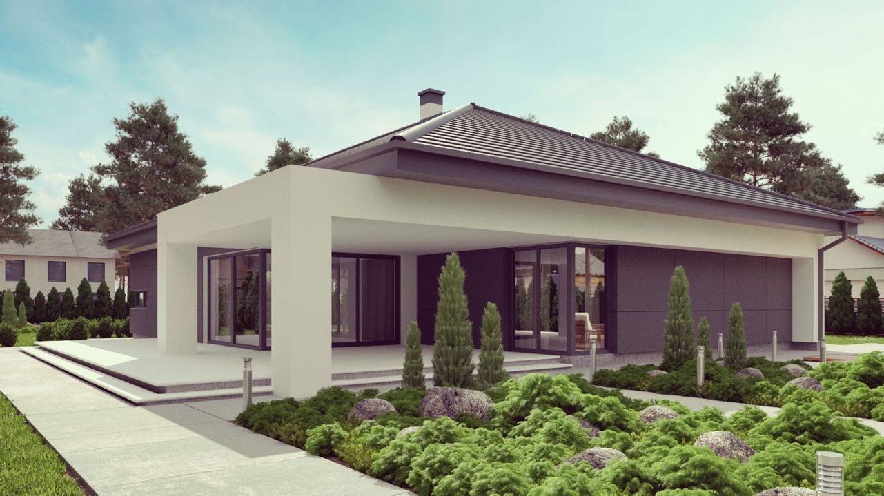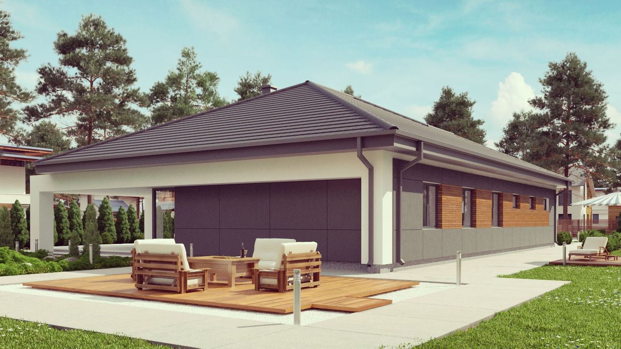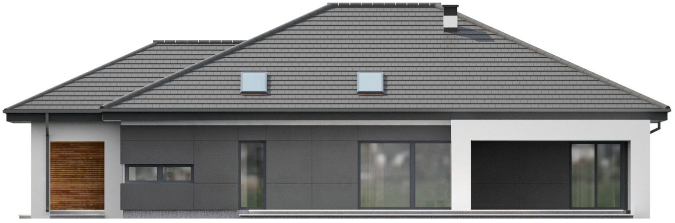 Graficzne opracowanie rzutów poglądowych widocznych na karcie projektu zostało wykonane przez Extradom.pl. Prezentowane przez Extradom.pl wizualizacje wykonane zostały przez autora projektu i należy poczytywać je jedynie za przykład i propozycję wykończenia, wizję architektoniczną autora projektu. Ostateczne wykończenie budynku może nastąpić na wiele sposobów. Szczegółowe rozwiązania zastosowane w oferowanej dokumentacji - w tym również ilość, lokalizacje i wygląd okien, drzwi, kominów - mogą w niewielkim stopniu różnić się od prezentowanej wizualizacji budynku.