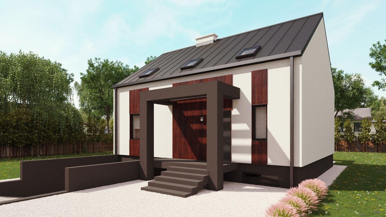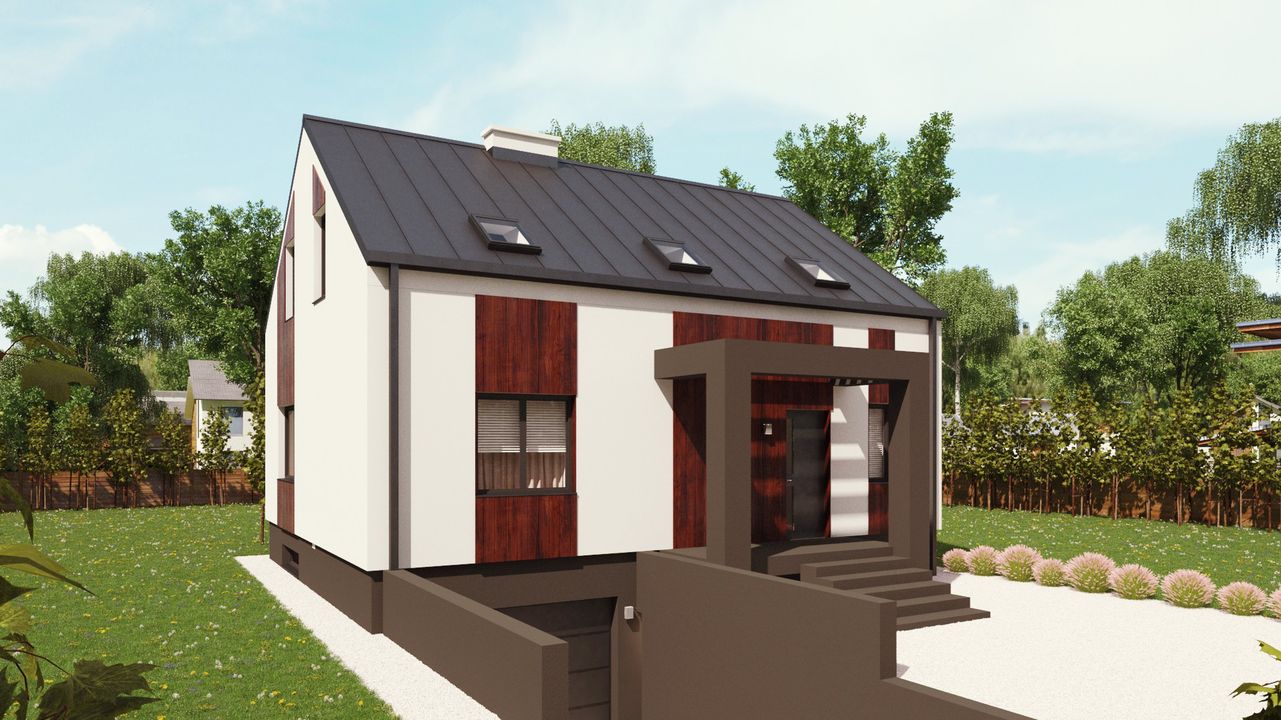 Graficzne opracowanie rzutów poglądowych widocznych na karcie projektu zostało wykonane przez Extradom.pl. Prezentowane przez Extradom.pl wizualizacje wykonane zostały przez autora projektu i należy poczytywać je jedynie za przykład i propozycję wykończenia, wizję architektoniczną autora projektu. Ostateczne wykończenie budynku może nastąpić na wiele sposobów. Szczegółowe rozwiązania zastosowane w oferowanej dokumentacji - w tym również ilość, lokalizacje i wygląd okien, drzwi, kominów - mogą w niewielkim stopniu różnić się od prezentowanej wizualizacji budynku.