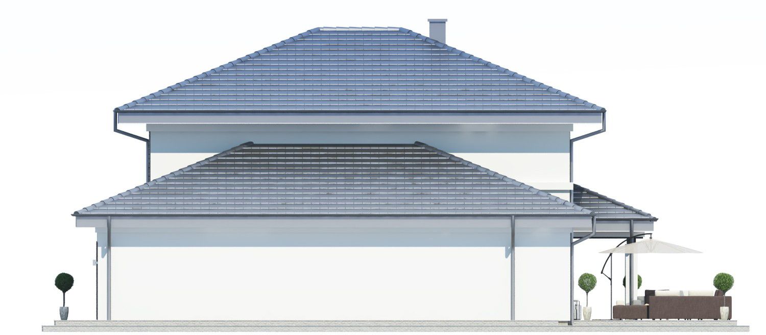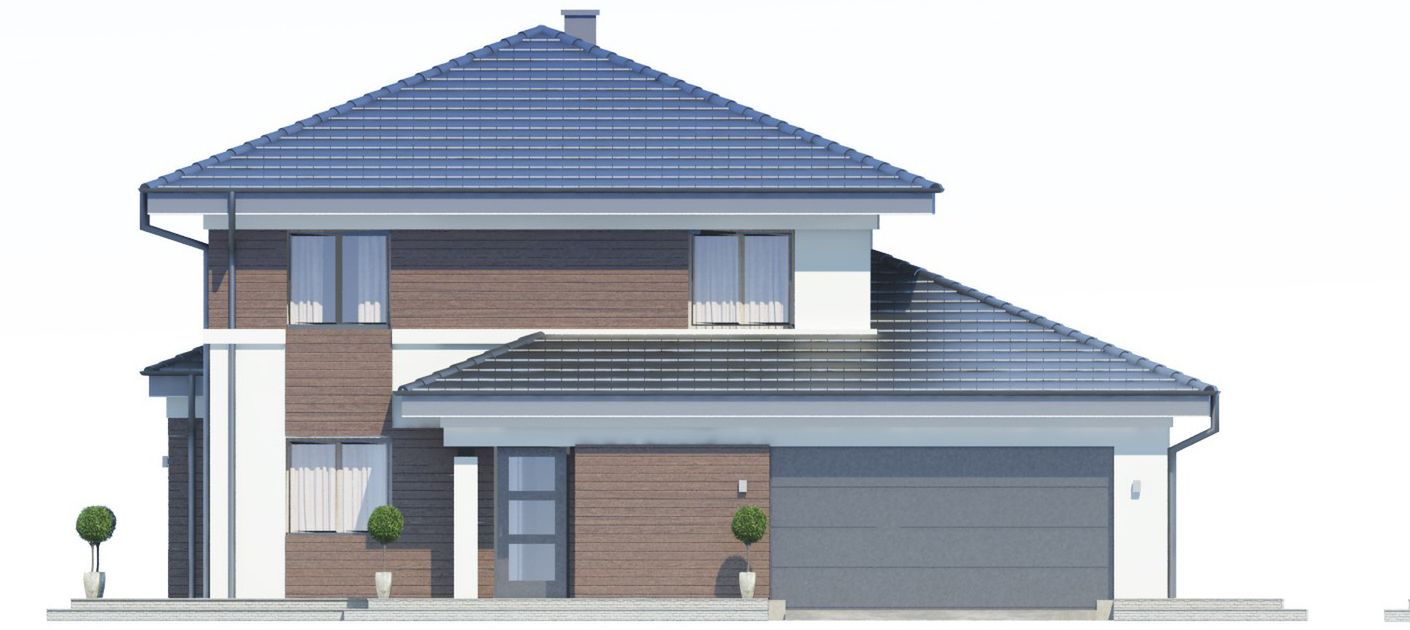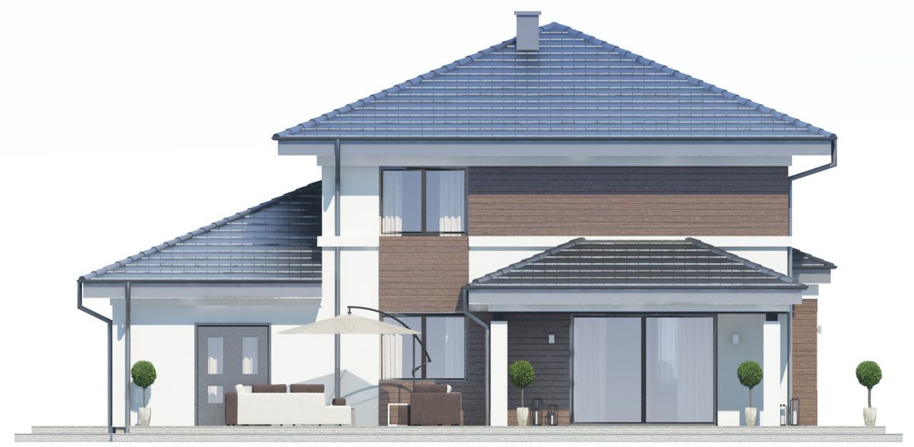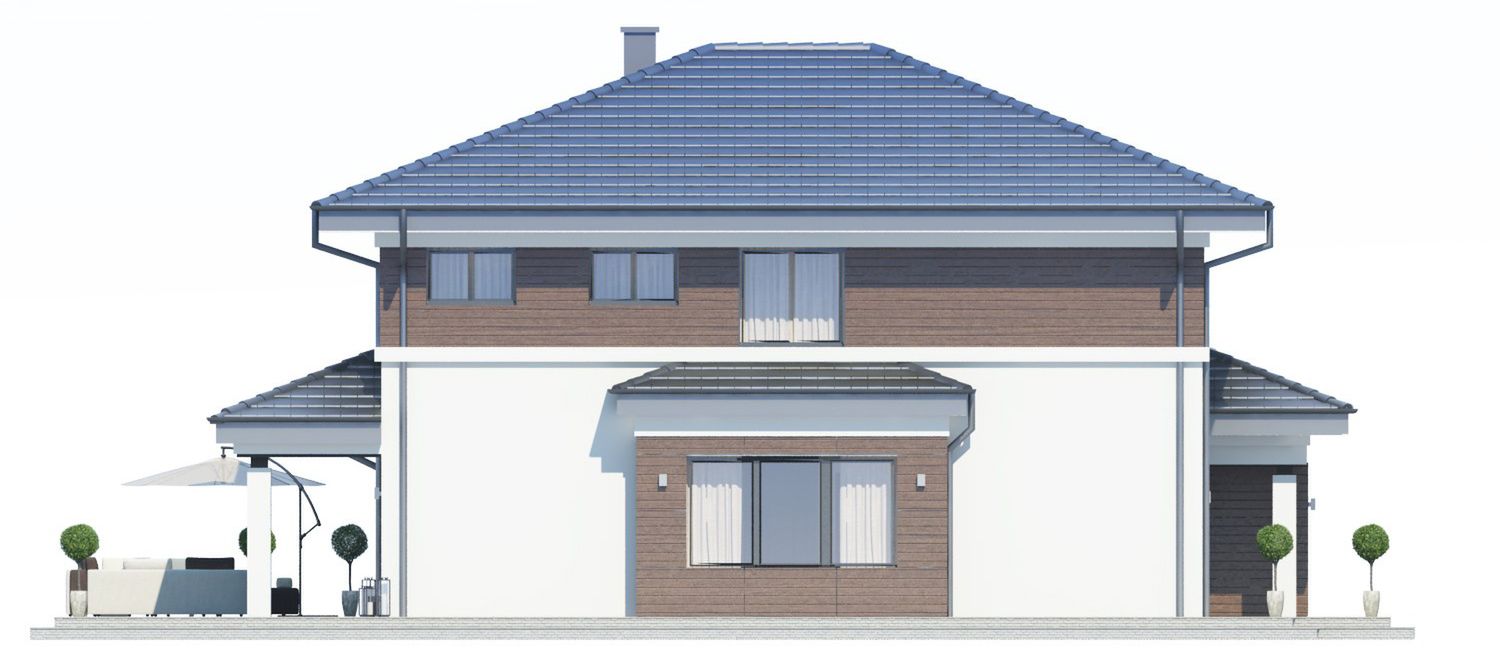 Graficzne opracowanie rzutów poglądowych widocznych na karcie projektu zostało wykonane przez Extradom.pl. Prezentowane przez Extradom.pl wizualizacje wykonane zostały przez autora projektu i należy poczytywać je jedynie za przykład i propozycję wykończenia, wizję architektoniczną autora projektu. Ostateczne wykończenie budynku może nastąpić na wiele sposobów. Szczegółowe rozwiązania zastosowane w oferowanej dokumentacji - w tym również ilość, lokalizacje i wygląd okien, drzwi, kominów - mogą w niewielkim stopniu różnić się od prezentowanej wizualizacji budynku.