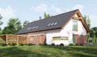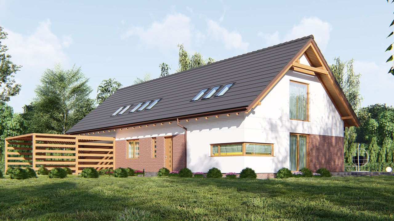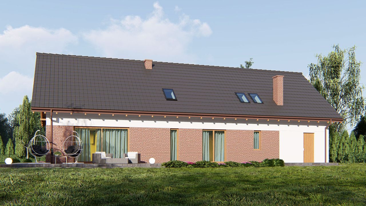 Graficzne opracowanie rzutów poglądowych widocznych na karcie projektu zostało wykonane przez Extradom.pl. Prezentowane przez Extradom.pl wizualizacje wykonane zostały przez autora projektu i należy poczytywać je jedynie za przykład i propozycję wykończenia, wizję architektoniczną autora projektu. Ostateczne wykończenie budynku może nastąpić na wiele sposobów. Szczegółowe rozwiązania zastosowane w oferowanej dokumentacji - w tym również ilość, lokalizacje i wygląd okien, drzwi, kominów - mogą w niewielkim stopniu różnić się od prezentowanej wizualizacji budynku.