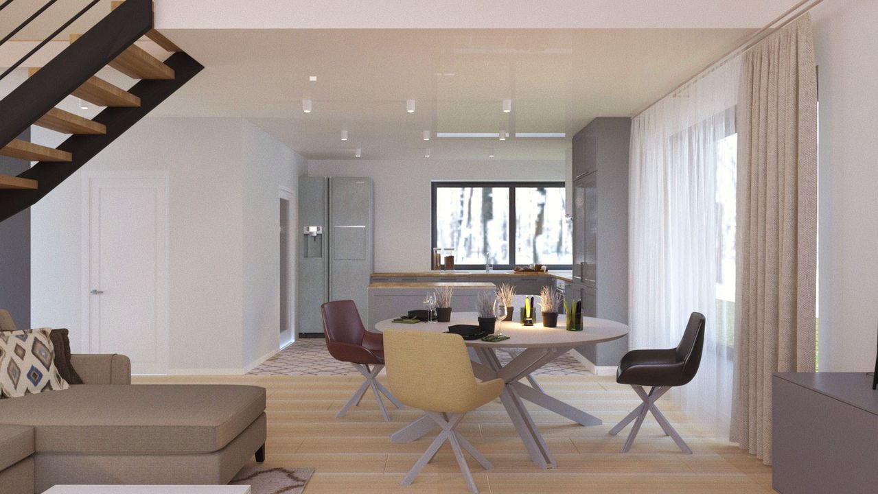 Graficzne opracowanie rzutów poglądowych widocznych na karcie projektu zostało wykonane przez Extradom.pl. Prezentowane przez Extradom.pl wizualizacje wykonane zostały przez autora projektu i należy poczytywać je jedynie za przykład i propozycję wykończenia, wizję architektoniczną autora projektu. Ostateczne wykończenie budynku może nastąpić na wiele sposobów. Szczegółowe rozwiązania zastosowane w oferowanej dokumentacji - w tym również ilość, lokalizacje i wygląd okien, drzwi, kominów - mogą w niewielkim stopniu różnić się od prezentowanej wizualizacji budynku.