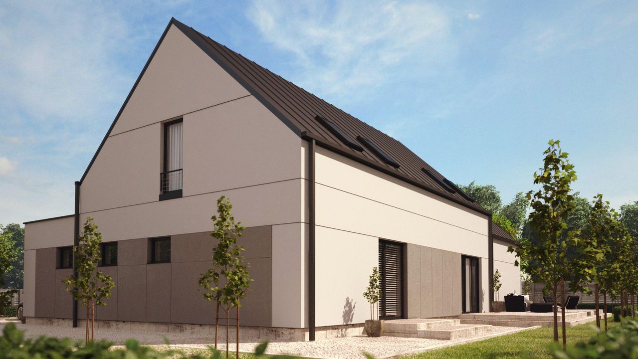 Graficzne opracowanie rzutów poglądowych widocznych na karcie projektu zostało wykonane przez Extradom.pl. Prezentowane przez Extradom.pl wizualizacje wykonane zostały przez autora projektu i należy poczytywać je jedynie za przykład i propozycję wykończenia, wizję architektoniczną autora projektu. Ostateczne wykończenie budynku może nastąpić na wiele sposobów. Szczegółowe rozwiązania zastosowane w oferowanej dokumentacji - w tym również ilość, lokalizacje i wygląd okien, drzwi, kominów - mogą w niewielkim stopniu różnić się od prezentowanej wizualizacji budynku.