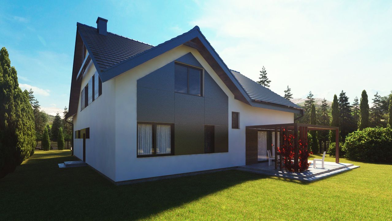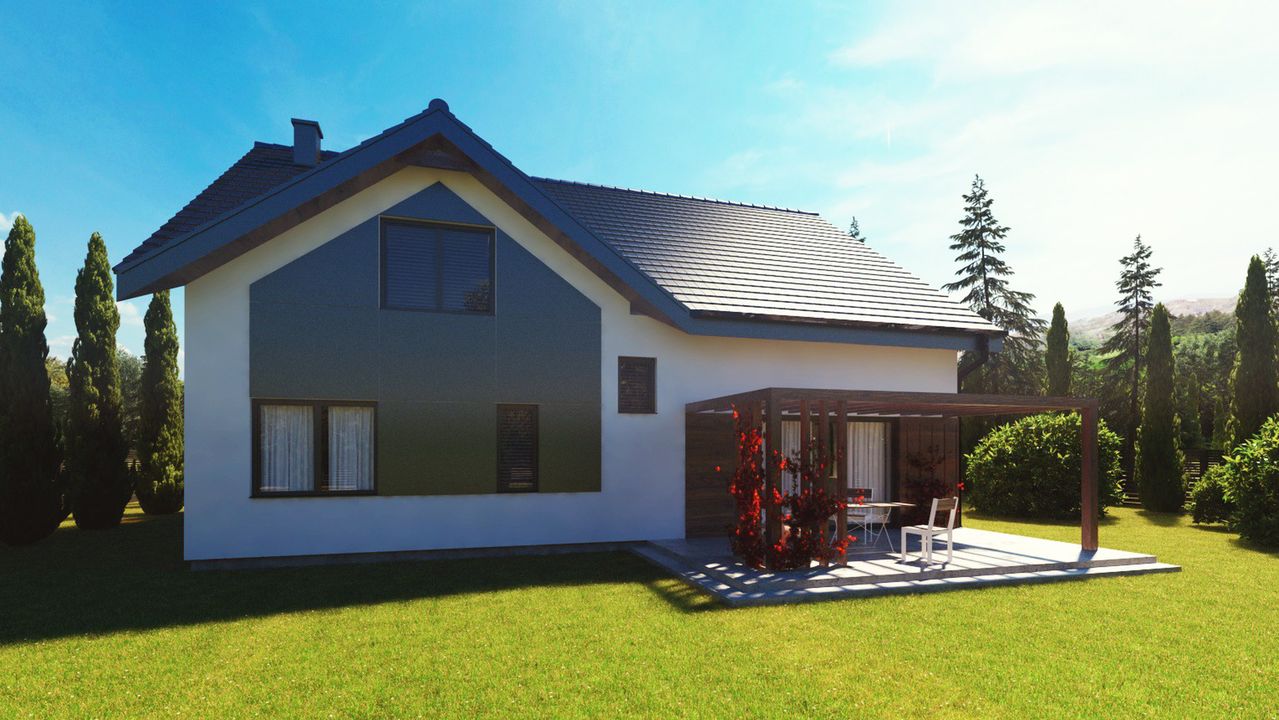 Graficzne opracowanie rzutów poglądowych widocznych na karcie projektu zostało wykonane przez Extradom.pl. Prezentowane przez Extradom.pl wizualizacje wykonane zostały przez autora projektu i należy poczytywać je jedynie za przykład i propozycję wykończenia, wizję architektoniczną autora projektu. Ostateczne wykończenie budynku może nastąpić na wiele sposobów. Szczegółowe rozwiązania zastosowane w oferowanej dokumentacji - w tym również ilość, lokalizacje i wygląd okien, drzwi, kominów - mogą w niewielkim stopniu różnić się od prezentowanej wizualizacji budynku.