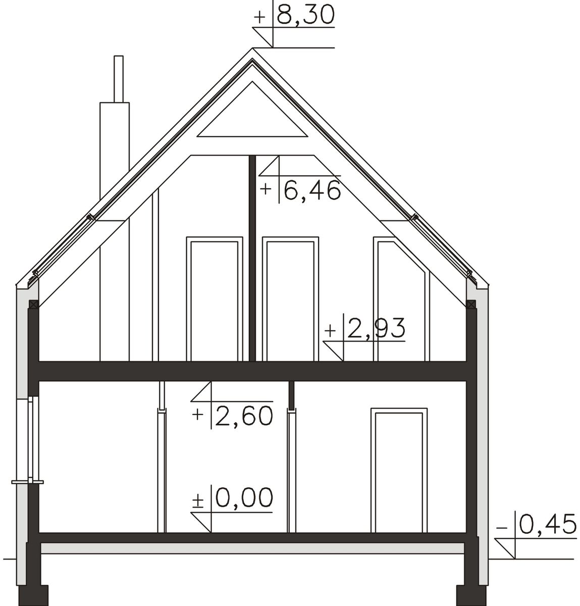 Fundamenty - rozwiązanie o podwyższonej izolacji termicznej. Ściany zewnętrzne - Bloczek silikatowy 18 cm + styropian 20 cm. Strop - gęstożebrowy. Dach - tradycyjna więźba ciesielska. Ogrzewanie - c.o. grzejnikowe + c.w.u. - kocioł gazowy. Wentylacja - rekuperacja.
