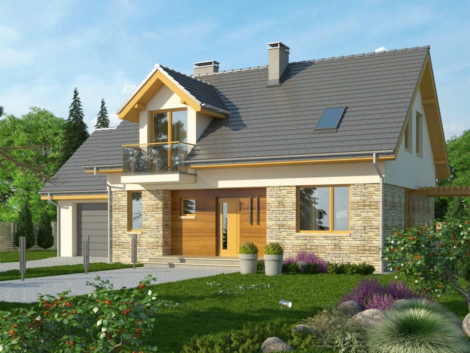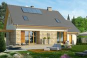 Wzniesienie ścian domu zaproponowano w projekcie z betonu komórkowego z dociepleniem od zewnątrz. Strop jest gęstożebrowy - tani i łatwy w montażu. Drewnianą konstrukcję dachu można pokryć praktycznie dowolnym materiałem, np. dachówkami ceramicznymi albo betonowymi. Ściany parteru zostały częściowo obłożone płytkami kamiennymi i drewnem, powyżej są tynkowane. Możliwe jest wybranie do realizacji domu też innych materiałów budowlanych i wykończeniowych pod warunkiem wprowadzenia odpowiednich zmian na etapie adaptacji.