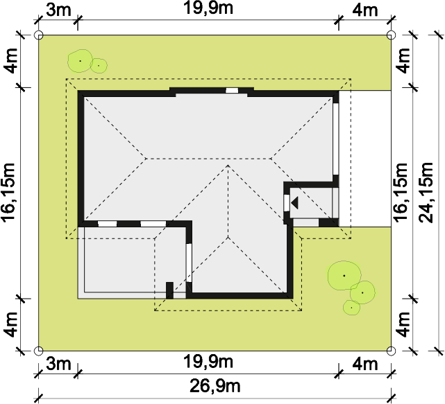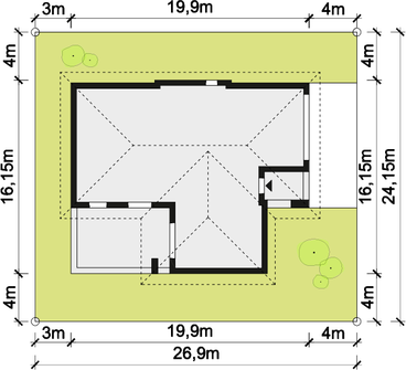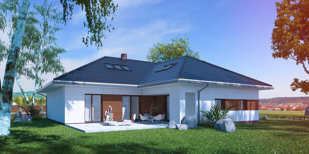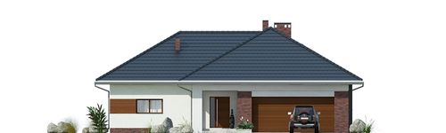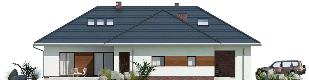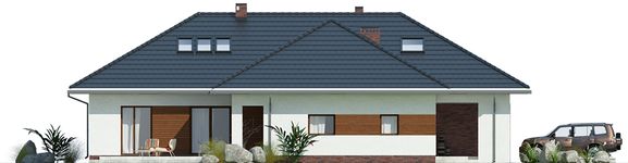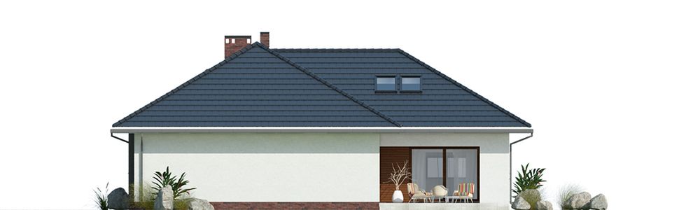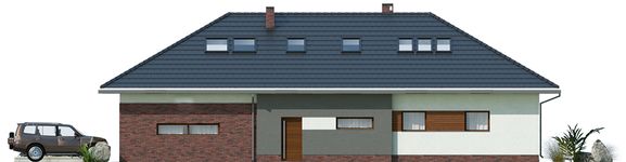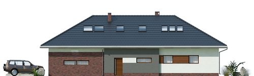 Graficzne opracowanie rzutów poglądowych widocznych na karcie projektu zostało wykonane przez Extradom.pl. Prezentowane przez Extradom.pl wizualizacje wykonane zostały przez autora projektu i należy poczytywać je jedynie za przykład i propozycję wykończenia, wizję architektoniczną autora projektu. Ostateczne wykończenie budynku może nastąpić na wiele sposobów. Szczegółowe rozwiązania zastosowane w oferowanej dokumentacji - w tym również ilość, lokalizacje i wygląd okien, drzwi, kominów - mogą w niewielkim stopniu różnić się od prezentowanej wizualizacji budynku.