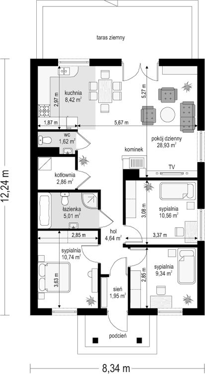 Posiadamy dosyć wąską działkę, dlatego najistotniejsze było dopasowanie budynku do jej wymiarów. Wybrany przez nas projekt domu Urwis WAH1261 idealnie się na niej zmieścił, a jego konstrukcja odpowiadała określonym przez gminę warunkom zabudowy. Cała inwestycja przebiegła sprawnie i zgodnie z planem, a fachowcom dobrze pracowało się z dokumentacją techniczną. Trzeba przyznać, że projekt Urwis jest domem szybkim w budowie. Mimo iż pogoda czasem nie pozwalała na wykonanie pewnych prac, a budowlańcy mieli również inne zobowiązania, wszystko udało się zakończyć w krótkim czasie. Postawienie budynku w stanie surowym zamkniętym zajmuje ok. 2 miesiący, a łącznie z wykończeniami pozwalającymi na zamieszkanie w domu ok. 1 roku.Postanowiliśmy trzymać się zaleceń architekta i zastosowaliśmy się do wskazanej w projekcie technologii budowy. Tym samym ściany wymurowaliśmy z gazobetonowych bloczków. Dach pokryliśmy blachodachówką, a strop tworzy drewniana konstrukcja na wiązarach kratownicowych. Na chwilę obecną myślę jednak, że dobrym pomysłem byłaby zamiana go na system Teriva, ponieważ odgłosy spowodowane przez „pracę” drewna słyszalne są w części mieszkalnej. W całym domu wstawiliśmy okna wysokiej klasy. Przy zastosowaniu powyższych materiałów, koszty inwestycji były sporo niższe niż oszacowane w kosztorysie. Uważam, więc że przyszli Inwestorzy projektu Urwis WAH1261 również mogą spokojnie zmieścić się w tej kwocie.Duże znaczenie miała dla nas jak najlepsza izolacja domu, dlatego w tej kwestii zwiększyliśmy wartości sugerowane w projekcie. Bryłę z zewnątrz ociepliliśmy 15 cm warstwą grafitowego styropianu, a na poddaszu zastosowaliśmy 30 cm wełny mineralnej o najkorzystniejszych parametrach jakie dostępne są obecnie na rynku. Wszystkie przeszklenia odznaczają się wysoką energooszczędością. Powyższe rozwiązania zaprocentowały bardzo atrakcyjnymi kosztami eksploatacji. Dom i wodę użytkową ogrzewamy za pomocą pieca na pellet, a na cały okrągły rok (od grudnia do grudnia) wystarczył nam opał nabyty za jedynie 2 tys. zł. Jest to naprawdę niska kwota, tym bardziej, że w pierwszych tygodniach od włączenia pieca poddasze nie było jeszcze zaizolowane.Odnośnie ogrzewania, należy jednak zwrócić uwagę na kotłownię. Oryginalnie została zaprojektowana z myślą o montażu pieca gazowego i przy tym rozwiązaniu sprawdziłaby się świetnie, aczkolwiek nie mieliśmy możliwości podłączenia do działki instalacji gazowej. Pierwotne wymiary pomieszczenia technicznego są zbyt małe na zainstalowanie pieca na paliwo stałe, dlatego musieliśmy przyłączyć do niego powierzchnię toalety. Gdy wybieraliśmy projekt, dom miał służyć tylko mi i mojej żonie, dlatego świetnym pomysłem na rozwiązanie tej kwestii wydało nam się zrobienie kotłowni w miejscu jednej z sypialni. Wtedy przy kuchni mogłaby powstać większa ubikacja i praktyczna spiżarka. Na początku budowy okazało się jednak, że wraz z nami zamieszka jeszcze nasz syn. Chcieliśmy aby każdy miał swoją własną przestrzeń, a dodatkowo zależało nam na miejscu do przenocowania gości, więc filanie zrezygnowaliśmy z tego pomysłu. Jeśli jednak ktoś miałby możliwość rezygnacji z jednego pokoju w celu zrobienia kotłowni na paliwo stałe, to bardziej polecam tę właśnie opcję.Metraż zaproponowany w projekcie domu parterowego Urwis WAH1261 jest optymalny dla naszej trójki. Właściwie ten dom można porównać do trochę większego mieszkania, jednak taką powierzchnię uważam za całkowicie wystarczającą. Wielkość budynku nie była moim priorytetem. Wcześniej mieszkałem w bloku, więc rozmiary pomieszczeń w nowym domu mi odpowiadają - chciałem po prostu aby był to obiekt wolnostojąc i tani w utrzymaniu. Pozdrawiam.