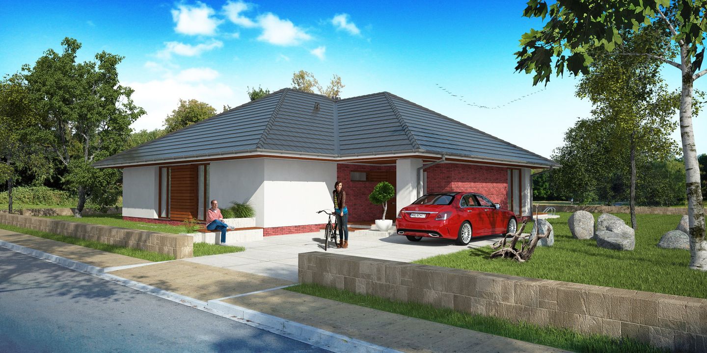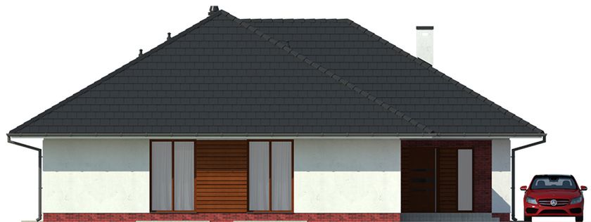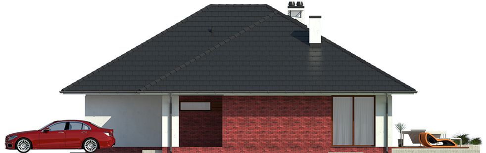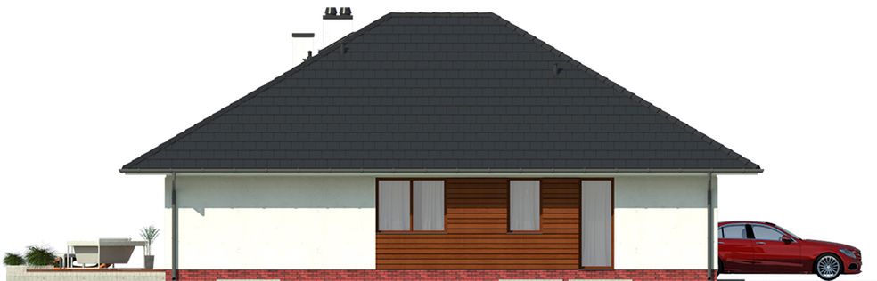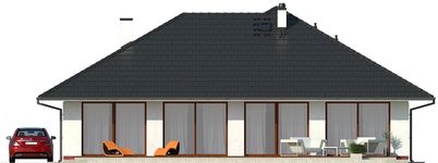 Graficzne opracowanie rzutów poglądowych widocznych na karcie projektu zostało wykonane przez Extradom.pl. Prezentowane przez Extradom.pl wizualizacje wykonane zostały przez autora projektu i należy poczytywać je jedynie za przykład i propozycję wykończenia, wizję architektoniczną autora projektu. Ostateczne wykończenie budynku może nastąpić na wiele sposobów. Szczegółowe rozwiązania zastosowane w oferowanej dokumentacji - w tym również ilość, lokalizacje i wygląd okien, drzwi, kominów - mogą w niewielkim stopniu różnić się od prezentowanej wizualizacji budynku.