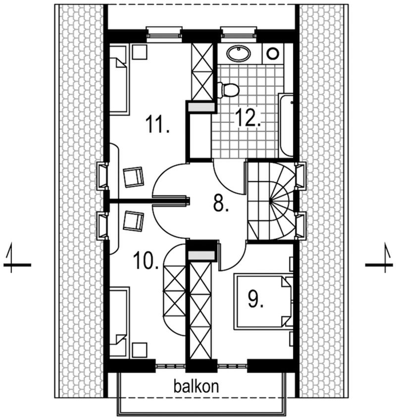 Ściany zewnętrzne dwuwarstwowe: cegła SILKA + wełna mineralna + tynk. Ściany wewnętrzne: cegła SILKA i/lub płyty na ruszcie stalowym, wygłuszone wełną mineralną. Strop: wylewany. Więźba dachowa: tradycyjna drewniana. Poszycie dachu: dachówka cementowa. Stolarka: drewniana lub PCV. Instalacja centralnego ogrzewania: kocioł dwufunkcyjny + grzejniki.