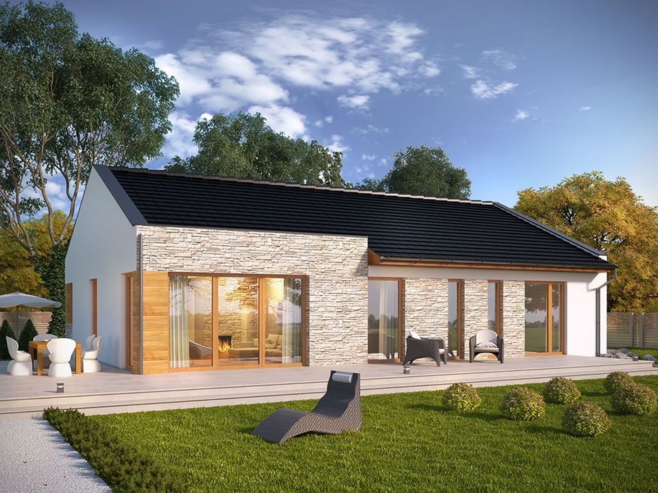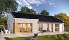 Graficzne opracowanie rzutów poglądowych widocznych na karcie projektu zostało wykonane przez Extradom.pl. Prezentowane przez Extradom.pl wizualizacje wykonane zostały przez autora projektu i należy poczytywać je jedynie za przykład i propozycję wykończenia, wizję architektoniczną autora projektu. Ostateczne wykończenie budynku może nastąpić na wiele sposobów. Szczegółowe rozwiązania zastosowane w oferowanej dokumentacji - w tym również ilość, lokalizacje i wygląd okien, drzwi, kominów - mogą w niewielkim stopniu różnić się od prezentowanej wizualizacji budynku.