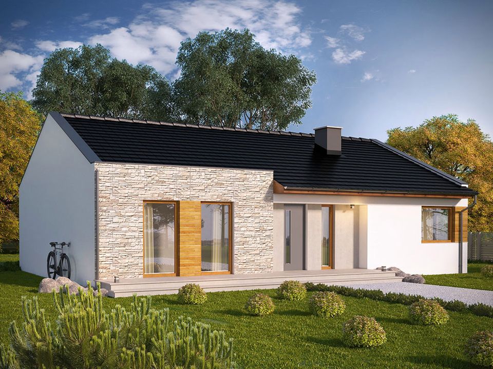 Dom wybudować można z bloczków z betonu komórkowego ocieplonych styropianem. Sufit podwieszony jest do drewnianej konstrukcji dachu - dzięki rezygnacji ze stropu nośnego znacząco zredukuje się koszt budowy. Zastosowano dachówkę ceramiczną jako pokrycie dachu, ściany wykończono tynkiem i płytkami kamiennymi. Podczas adaptacji wprowadzić można inne materiały. Dokumentacja dostępna jest także w wersji lustrzanej.