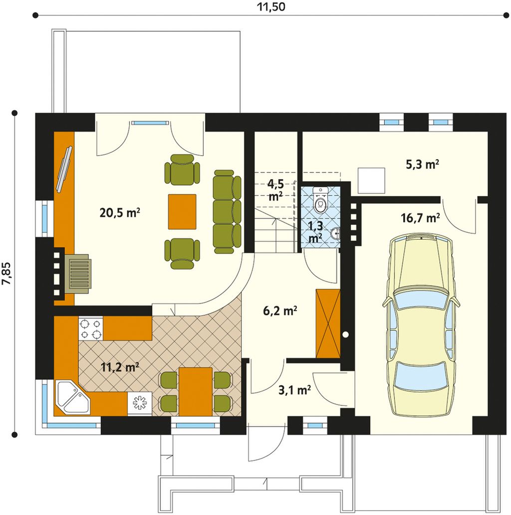 Graficzne opracowanie rzutów poglądowych widocznych na karcie projektu zostało wykonane przez Extradom.pl. Prezentowane przez Extradom.pl wizualizacje wykonane zostały przez autora projektu i należy poczytywać je jedynie za przykład i propozycję wykończenia, wizję architektoniczną autora projektu. Ostateczne wykończenie budynku może nastąpić na wiele sposobów. Szczegółowe rozwiązania zastosowane w oferowanej dokumentacji - w tym również ilość, lokalizacje i wygląd okien, drzwi, kominów - mogą w niewielkim stopniu różnić się od prezentowanej wizualizacji budynku.